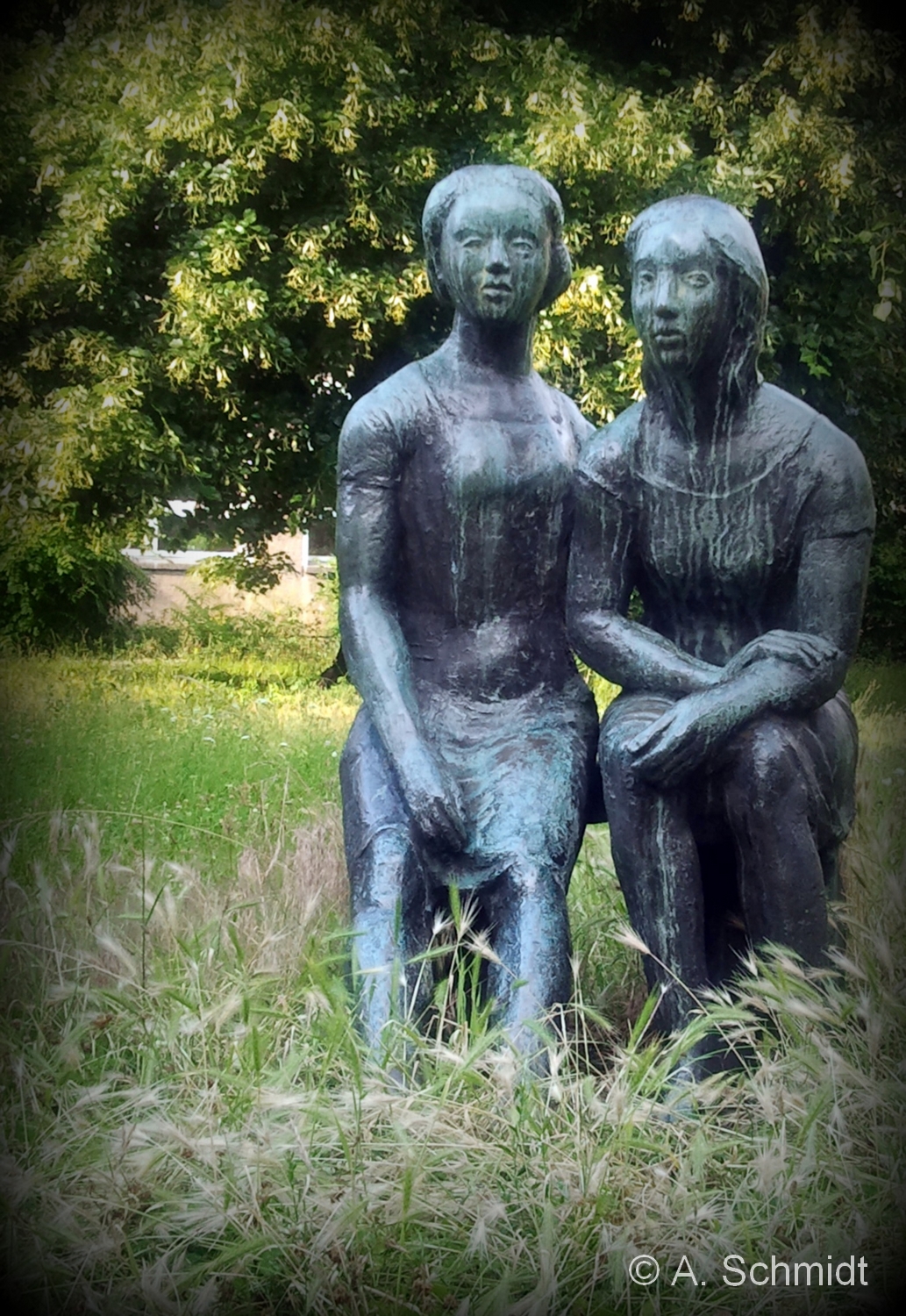 How many places do you cross every once on in a while that you have never really noticed? The other day, we came by a school’s forecourt with a tiny meadow that we have passed often already. It’s summer holidays in Berlin, and therefor the place was empty – and the grass had obviously not been cut since quite some time. In the corner of the little meadow, we recognized a small beautiful statue showing two young women cowering in the grass.