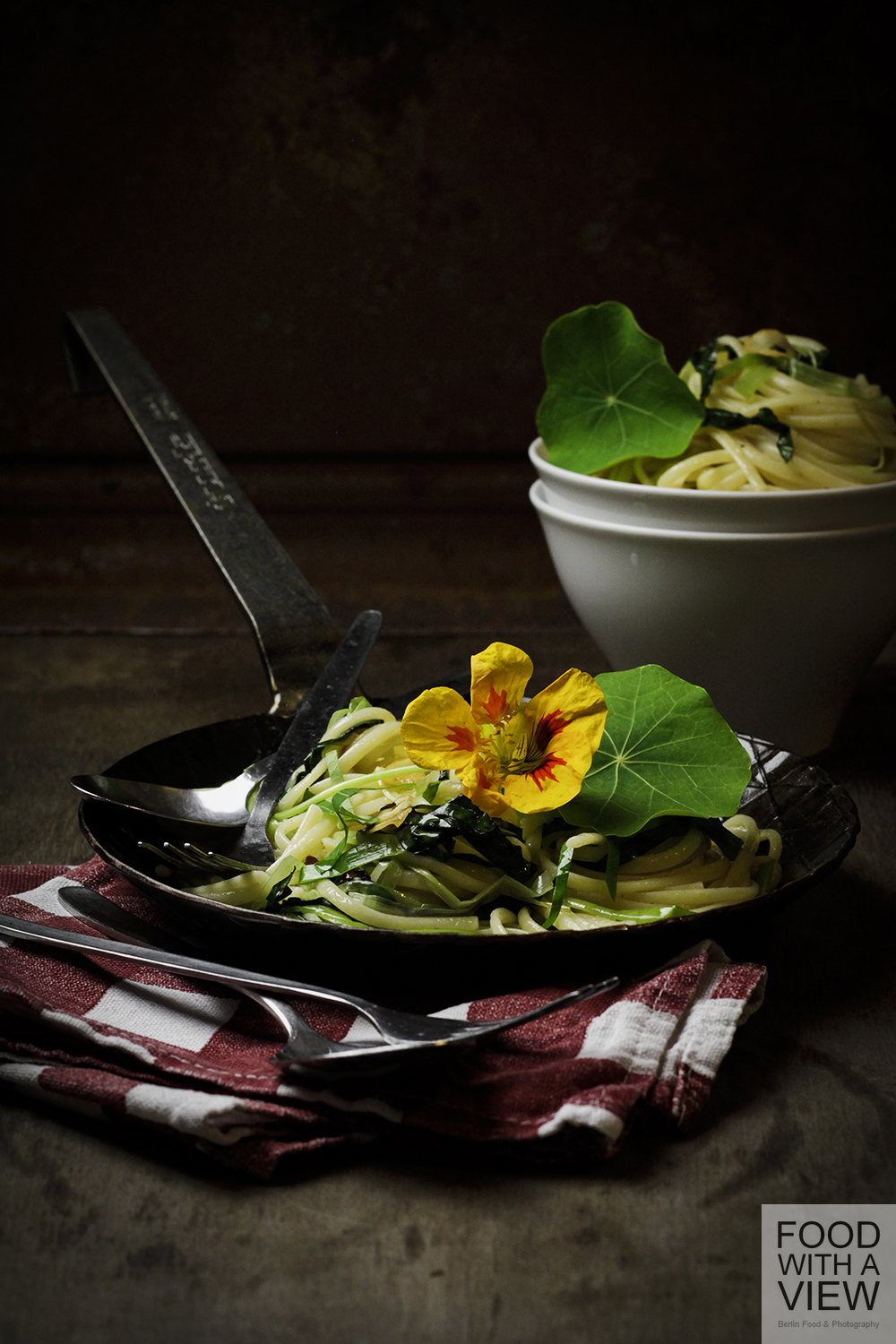 Indeed, it’s perfect autumn weather these days in Berlin, and lately I spent a perfect sunny afternoon at a friends garden (which I had mentioned in the recipe for asparagus soup with goutweed already). When I left, she gave me some beautiful food photo props, some lovely beetroot leaves and tropaeolum leaves and blossoms. Back home, I made fettuccine with the greens that tasted so fine of autumn already with warm and earthy flavors, and taking the food shots in total darkness outside at 8 pm, I thought: How can it be that October is here already?
