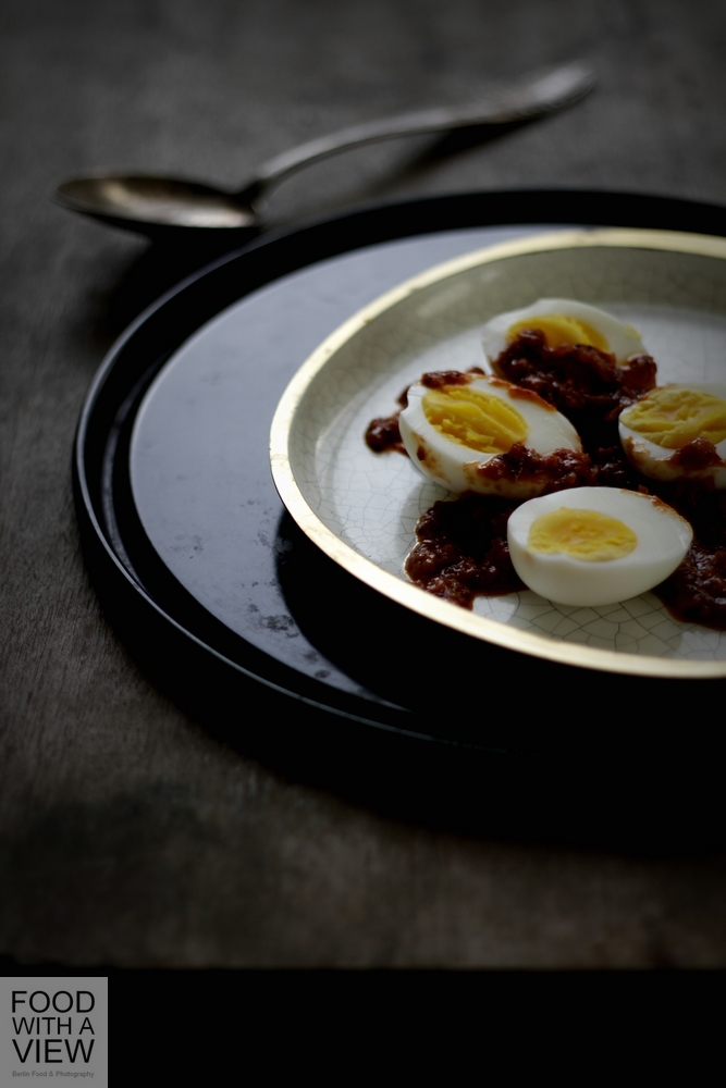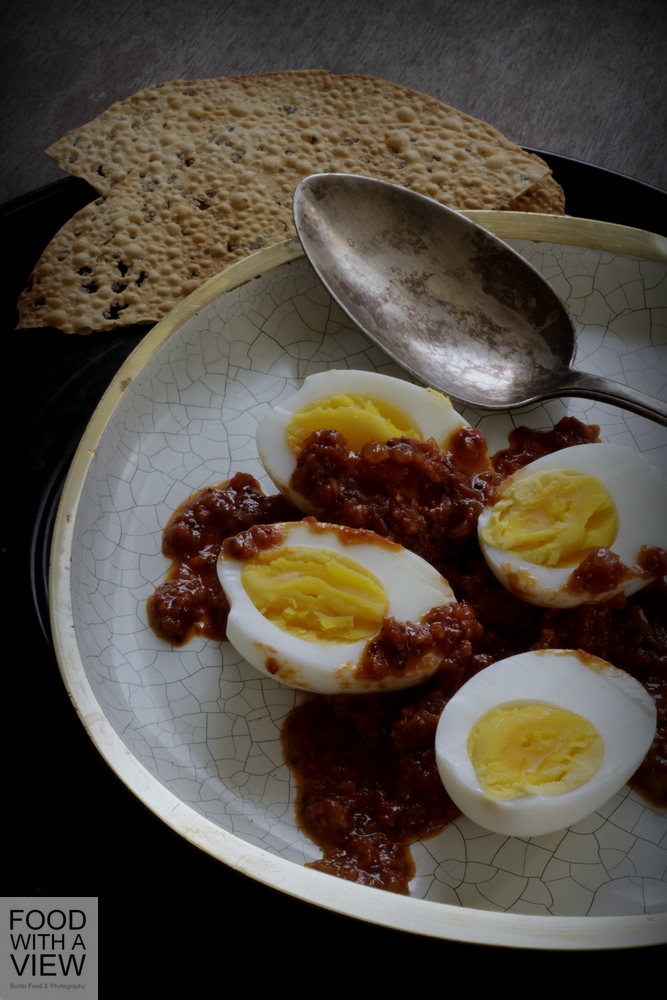 Schließlich kamen – zum Frühstück – Goa-Eier an die Reihe. Ein Traum mit einer doppelt eingekochten würzigen Sauce auf Basis von Tomaten, Zwiebeln (ich, wie immer: Schalotten), Ingwer und Knoblauch und allerlei Gewürzen, die sich wunderbar mit den wachsweich gekochten Eiern verbunden hat. Essig war hier „nach Geschmack“ angegeben, und nach einem von vier Löffeln fand ich die Säure bereits ausreichend. Nicht ganz so ausreichend war die Sauce bemessen – ich habe die angebene Menge für nur die Hälfte an Eiern verwendet und das war dann prima.
