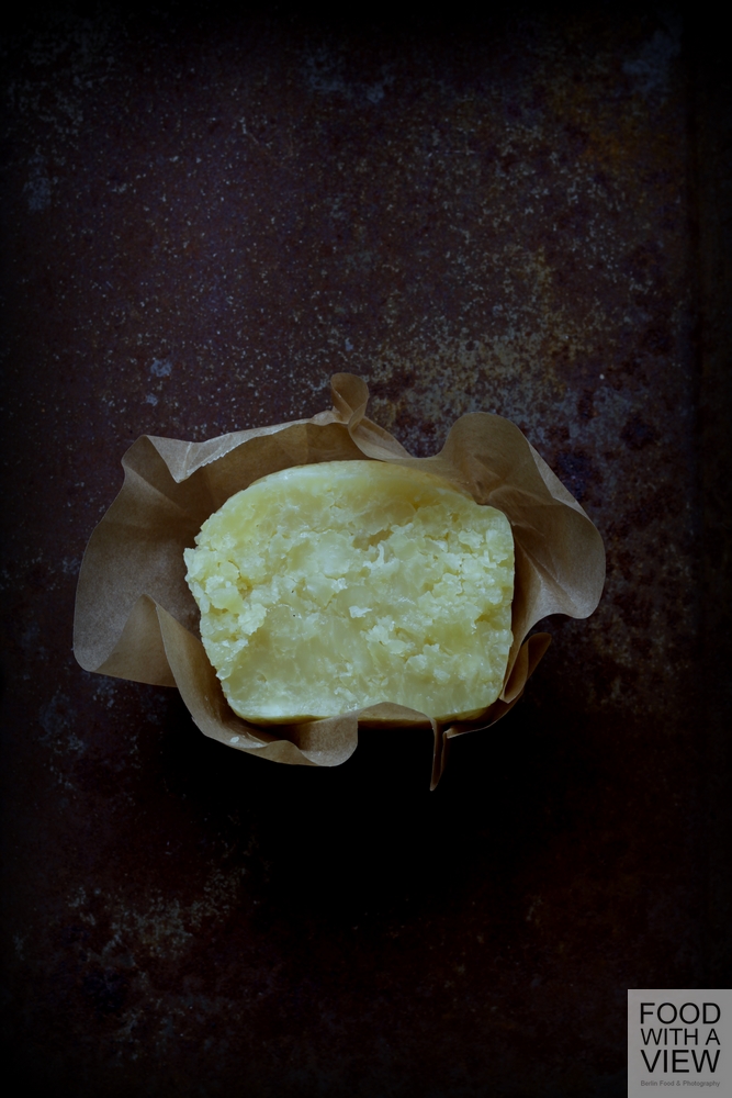 Aus der Stockholmer Küche im Abschlusskapitel hatte mich unbändig der Gebratene Schwarzkohl mit Alp-Sbrinz gelockt. Sbrinz konnte ich ergattern, Cavolo nero leider nicht, musste also Grünkohl herhalten. Auch hier kommt relativ viel Fett zum Einsatz, aber bei Kohlgerichten bin ich als Norddeutsche in der Hinsicht Kummer gewohnt und habe das durchgewinkt. Das Ergebnis war absolut köstlich, und das sogar, obwohl ich die Sardine in der gewürzten Butter weggelassen und durch Rauchsalz (das an anderer Stelle im Buch ebenfalls zum Einsatz kommt) ersetzt habe.