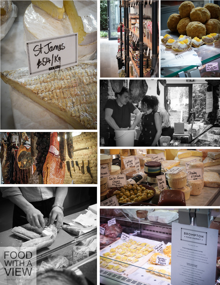 Ein echtes Highlight entdeckten wir im an kulinarischen Angeboten aller Art nicht gerade armen South Kensington, und zwar den Brompton Food Market. Auf der Suche nach diesem und jenem kamen wir mit dem sehr netten Besitzer des erst in der Vorwoche eröffneten Feinkost-Geschäfts ins Gespräch – über Essen, Food Blogs und die Londoner Mieten, die im Vergleich zu Berlin natürlich ein Alptraum sind. Ein Traum hingegen waren die englischen Käsesorten, die wir probieren durften – es ist ein Jammer, dass man in Berlin nur selten mehr als Cheddar und Blue Stilton angeboten bekommt, denn für den würzigen St. James Weichkäse, mit dem wir uns am Ende sehr leckere Baguettes for take-away haben belegen lassen, würde ich so einiges stehen lassen. Mit einer letzten Kostprobe – Stilton & Schokolade, ich sage ja immer, das Käse und Schoki bestens zusammen passen, aber kaum jemand mag mir glauben – verließen wir diesen schönen Ort, der demnächst auch eine kleine Innenhof-Terrasse haben wird. Wir kommen bestimmt wieder und probieren die frische Pasta, schottische Eier und all die Dinge, die man schlecht im Handgepäck verstauen kann.