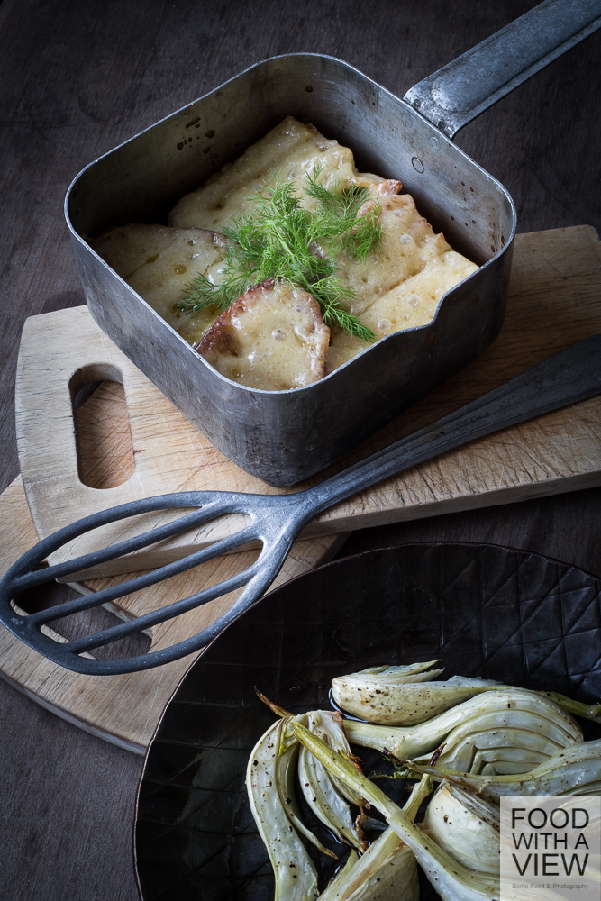 Put both dishes into the preheated oven (200 ° C) and cook for about 20 minutes. Take care for the cheese – it should not get too crisp and brown, cover the dish with some heat-resistent kitchen foil to prevent it from burning if needed. Take both dishes out of the oven, sprinkle the bread & cheese casserole with fennel leaves and add some ground long pepper and sea salt on top of the fennel. Serve with a young, fresh wine like Grüner Veltliner and enjoy your meal!