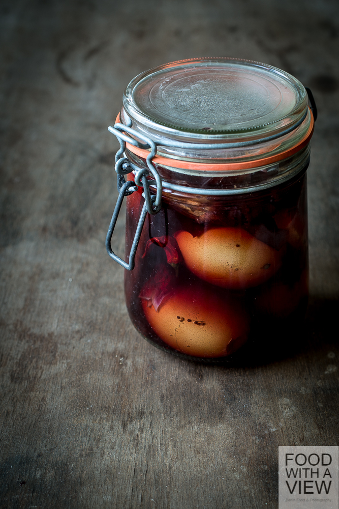 Today, most recipes recommend to pickle the eggs only after peeling them, and it’s no longer mere sole that is used for it but a spicy stock. However, I stick with aunty Trudel, a friend of my Hessian grandmother. She was originally from Berlin where she had a nice upper class living with tennis lessons and sports cars – she was definitely not dining at inn’s, I suppose, nevertheless she knew and loved pickled eggs. Her descriptions of big jars with lots of onion peels in a dark broth with some eggs mystically shining through and uncovering their beauty only after peeling had quite an impact on me as a child already, so I can’t help but following this anachronistic, yet enchanted way. Regarding measurements of salt and water, I asked Wikipedia for advice, and when it came to vinegar, I tried as long as it took to get it right. This treat is gluten-free unless you use a gluten-free sort of mustard.