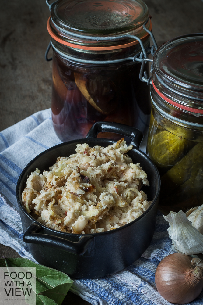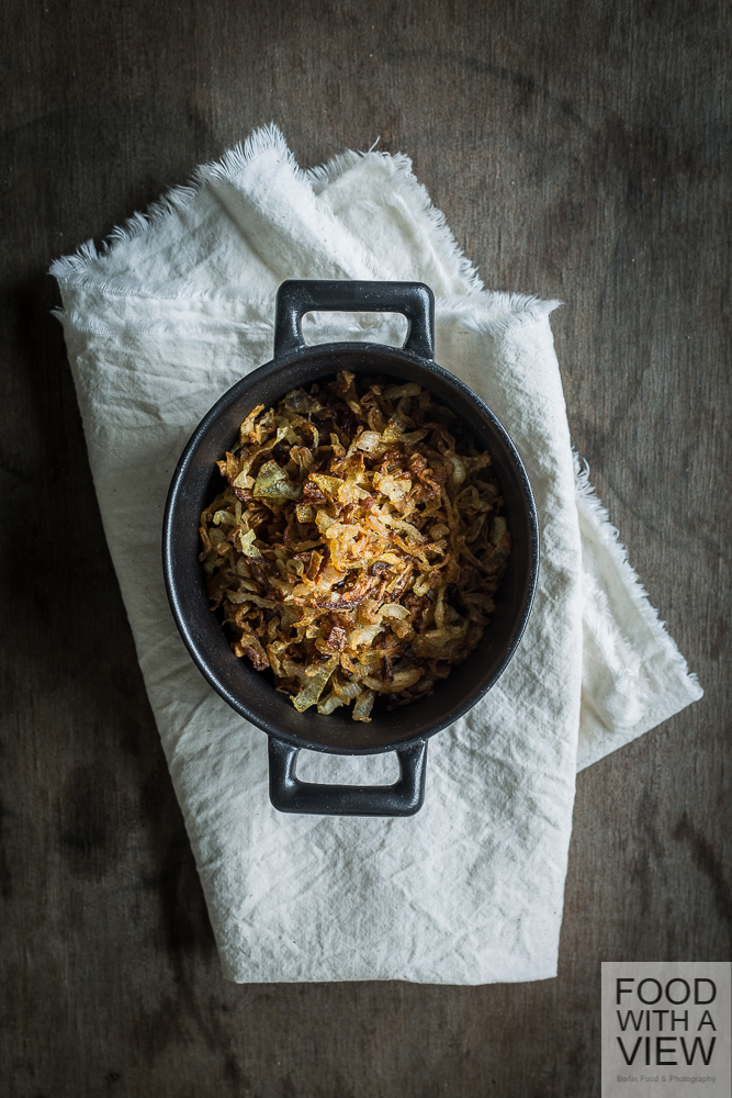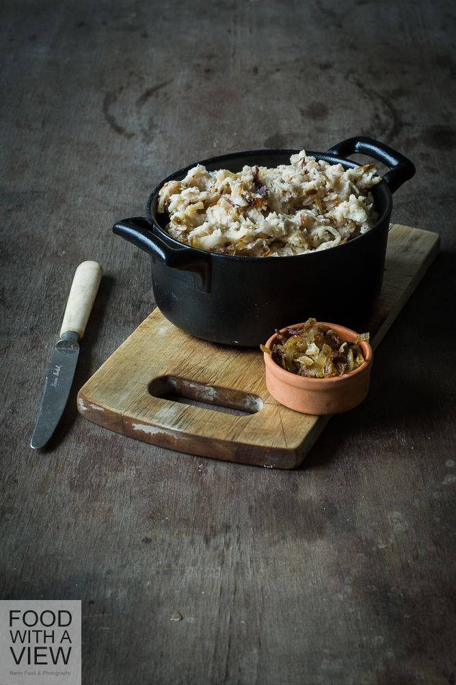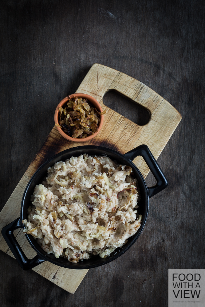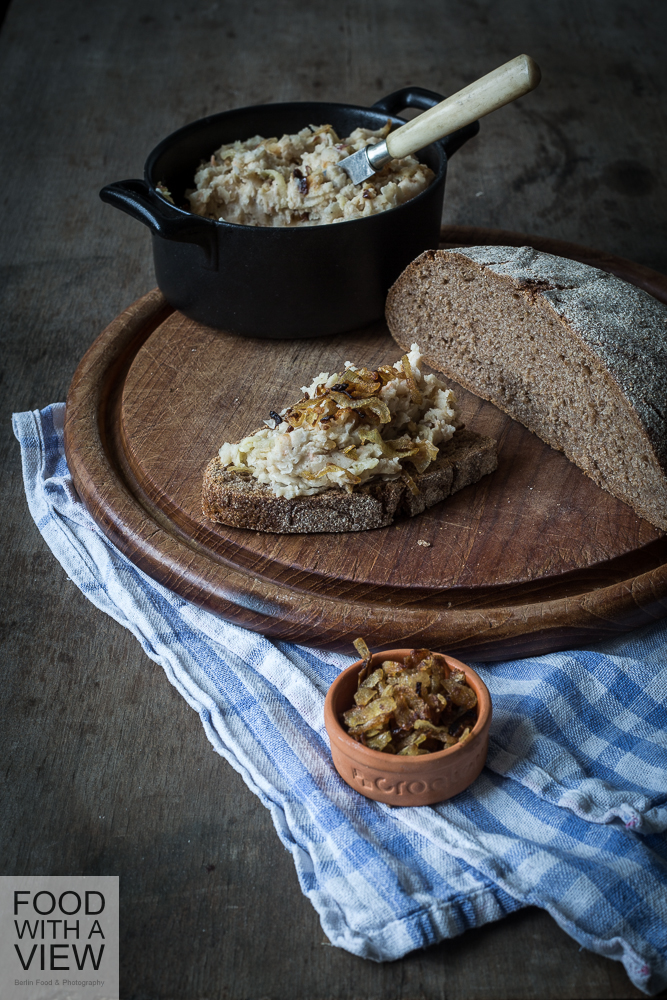 The German word for this recipe is literally „bean-lard“. I guess that sounds funny in English, doesn’t it. Apart from linguistics, it’s a spread that consists of mashed white beans, roasted onions, oil, and grated apple. In Berlin – like elsewhere – it had been a cheap substitute for real lard and is rediscovered as a fine treat today. Taste and consistency a similar to the kind of spiced lard that is used as a sandwich spread in rural cuisines all across Germany. I came across a recipe for this in my early years as a student and I have prepared it ever since. High time to have a post with it! This treat is vegan, however not gluten-free.