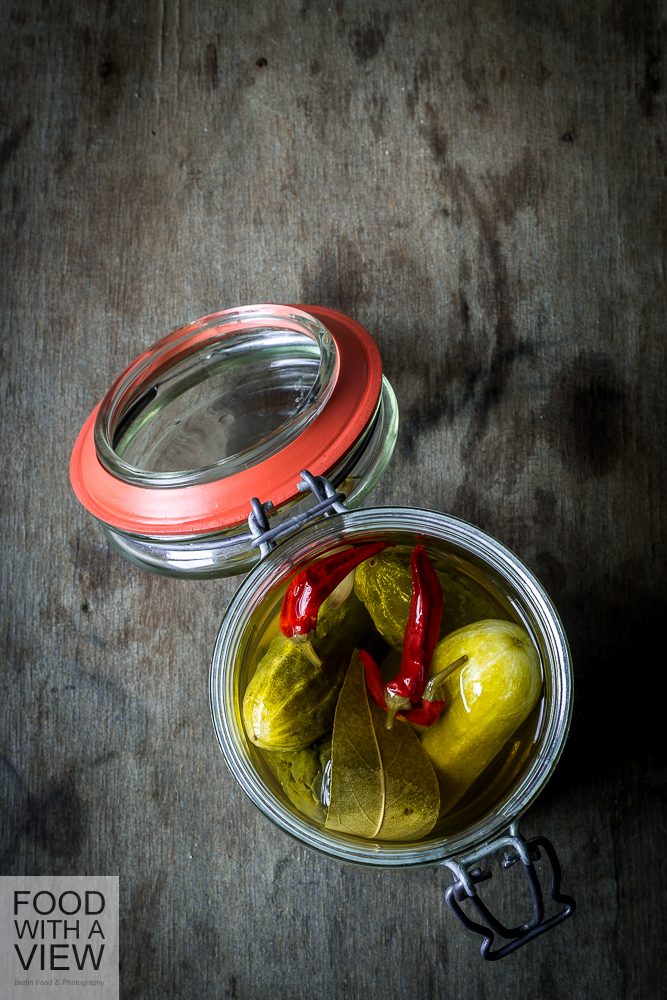 Cucumbers can be pickled raw in tubs (they will develop liquid on their own), or preserved them in jars – that’s what I learned on many different Spreewald websites. I chose preservation and tried to find an own way for the stock’s measurements. Fortunately, it worked. This treat is vegan and gluten-free.