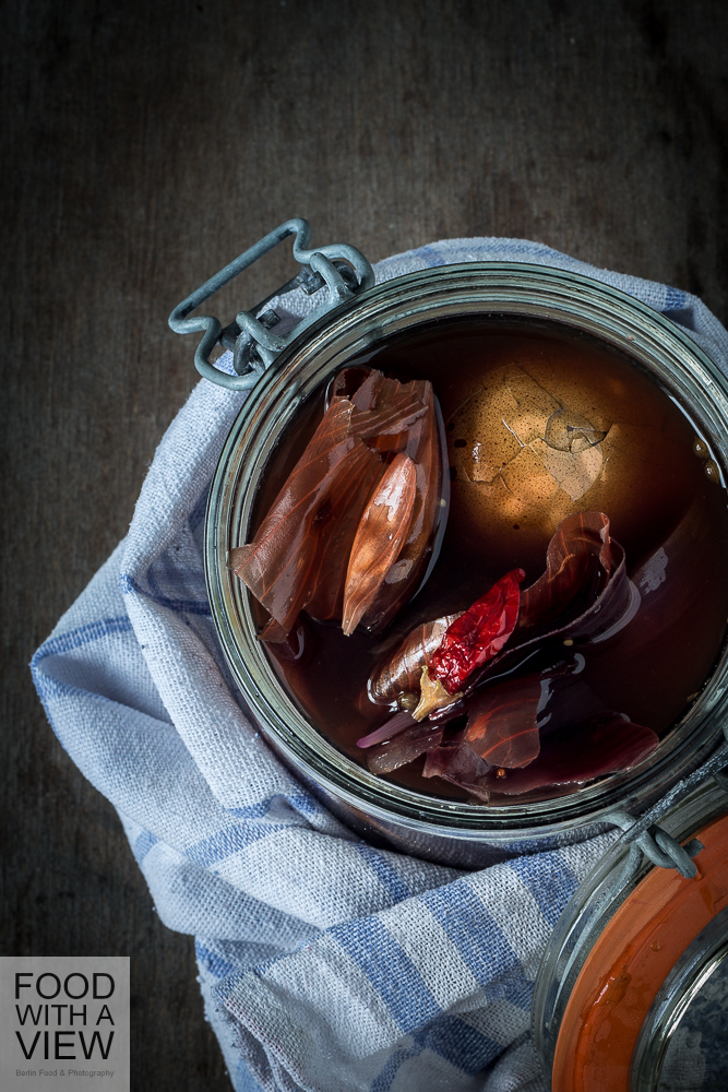 Die Eierschalen rundum anstoßen und die Eier abwechselnd mit den festen Bestandteilen aus dem Sud in das Glas schichten. Den Sud darüber gießen – die oben schwimmenden Eier sollten möglichst bedeckt sein. Mindestens einen Tag ziehen lassen, dann sind Marmorierung und Aroma dezent, perfekt ist es für meine Begriffe ab Tag drei.