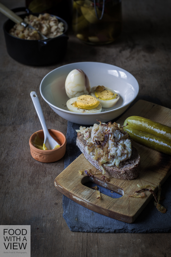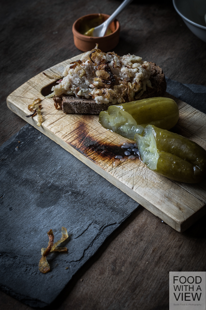 A staple of Berlin cuisine – both now and then – are little snacks for consumption in between. At the turn of the century, most inn’s presented those snacks in so called Hungertürme which translates to hunger towers. Those have been glass cabinets with simple home-made treats to fill the stomach quickly and at a low budget. It often contained pickled cucumbers from Spreewald, pickled eggs, and slices of bread spread with spicy lard that has often been substituted by much cheaper bean spread. I’ve tried to prepare the three of them in a modern way: with coriander-spiced bean spread, eggs with an oriental twist and cucumbers which come in a hot version with chili and garlic. It’s a match – and it continues the culinary Berlin tradition of bringing along and varying things according to your own taste that we can identify with so well.