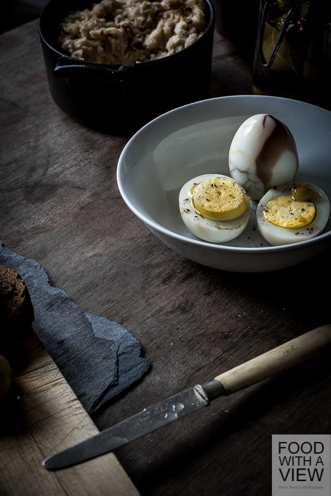 In Berlin, pickled eggs are traditionally eaten this way: cut an egg into halves, take off the egg yolks, add some mustard to the egg white, carefully put in again the egg yolks, season with oil, vinegar, salt and pepper. I followed this tradition with just a little turmeric twist in the mustard – it matches the other flavors quite well.