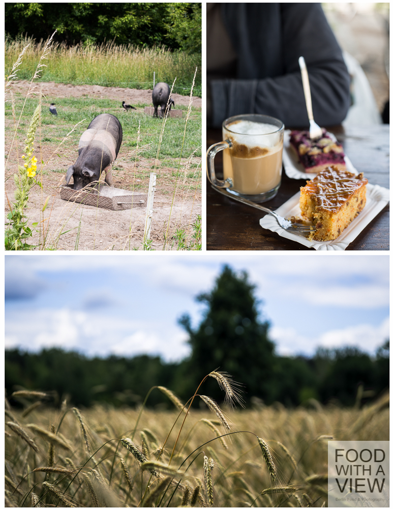 I have known mulberries by name since my childhood’s fruit pairs game but I have never eaten them, at least as far as I know. Over here, they are sold in shops and on markets rarely, and if you don’t have a bush in your own garden, you usually have to get along without them. Therefor we were quite happy when we found them for sale on our visit lately at Domäne Dahlem (German language only), an organic farm on the edge of Berlin which is still part of the city. The place is a little agricultural oasis, an idyll with acres, gardens, lots of animals, and with a museum presenting the history of the former manor.