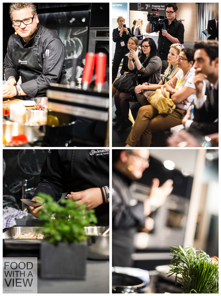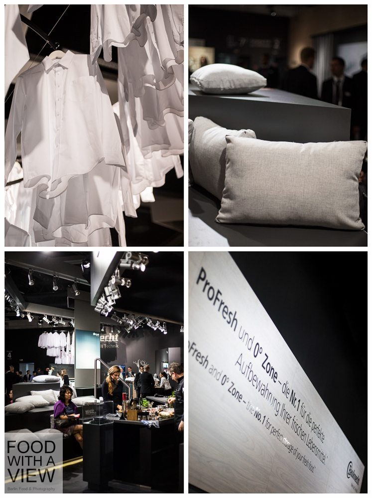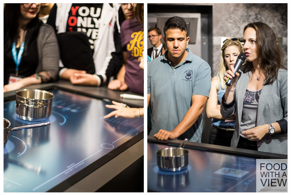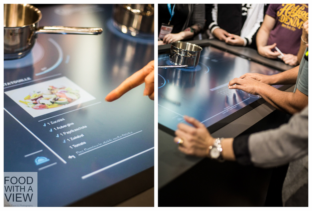 Wir blieben noch ein bisschen beim Kochen und durften mit Désirée Duray einen Blick in die Zukunft werfen, und zwar mit der Welt-Neuheit einer interaktiven Kochfläche. Ich müsste wahrscheinlich noch ein bisschen üben, um parallel den Regenradar (Balkon-Dinner), meine E-Mails (Gäste-Schwund) und – ebenfalls digital – die Kühlschrank-Vorräte (Parmesan-Schwund) zu checken und gleichzeitig darauf zu achten, dass ich den Risotto-Topf nicht aus Versehen auf den Wetterbericht ziehe, während ich nebenbei ein Drei-Gänge-Menü vorbereite. Aber mich hat schon rein von der technischen Möglichkeit her absolut fasziniert, wie künftig Haushaltsgeräte und digitale Anwendungen miteinander verknüpft und über ein kombiniertes Kochfeld und Touch-Display bedient werden können. Für Food-Blogger tun sich da ungeahnte Möglichkeiten auf: während das Pasta-Wasser heiß wird, schon mal die Zutaten für die dazugehörige Sauce in den Post-Entwurf eintippen; die Mengenangaben für den Nachtisch aus dem digital gespeicherten Rezept der Kollegin aus der Blogroll ohne Zettelwirtschaft umrechnen; zeitgleich über Facebook mitteilen, wie gut Tomaten und Vanille zusammen passen; und das Lieblings-Öl aus dem Online-Shop nachbestellen, weil der Kühlschrank vermeldet hat, dass es schon wieder aus sei. Großartig, oder? Das Internet der Dinge ist mir schon länger ein Begriff, aber mal ein reales Beispiel in Aktion zu sehen, war für mich ein Highlight der Führung.