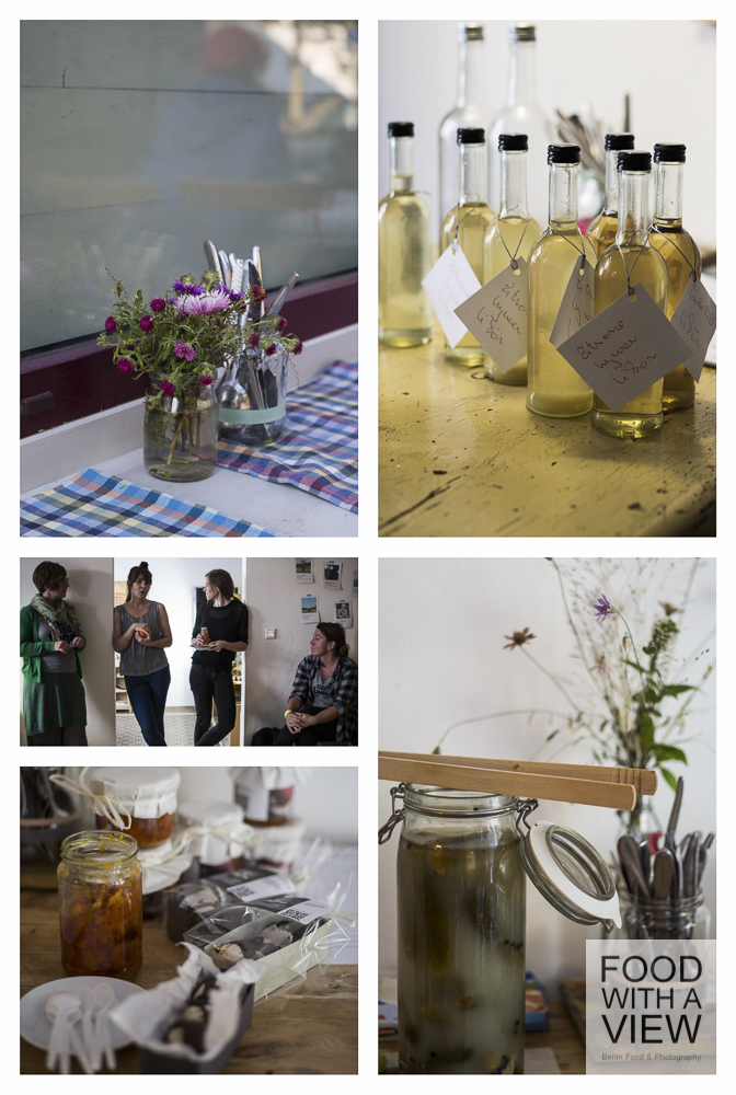 Aber alles wurde gut. Denn so eine foodXchange ist eine tolle Sache – eine neue Form der Ökonomie, wie eine anwesende Wissenschaftlerin auf Feldforschung von just meinem alten Institut an der Humboldt-Universität es formulierte. Ich war freudig überrascht von dieser unverhofften Begegnung – und natürlich von der neuen Ökonomie selbst, der wir dann alle tauschend frönten. Die funktioniert so: Jede und jeder bringt mit, was man geerntet, gekocht, eingemacht oder gebacken hat, und dafür muss man nicht mal einen Food-Blog betreiben, sondern einfach nur Spaß an Selbstgemachtem haben. Das drappiert man mit appetitanregenden Probierhäppchen, und dann wird gekostet, alles und restlos. Anschließend wird gefeilscht und getauscht: Wieviel Zitronen-Tarte kosten die Apfel-Chips, gibst Du mir Safran-Birnen, wenn ich dafür Bettlermarmelade biete, wie viele Quitten ist Dir mein Sanddorn-Sirup wert.