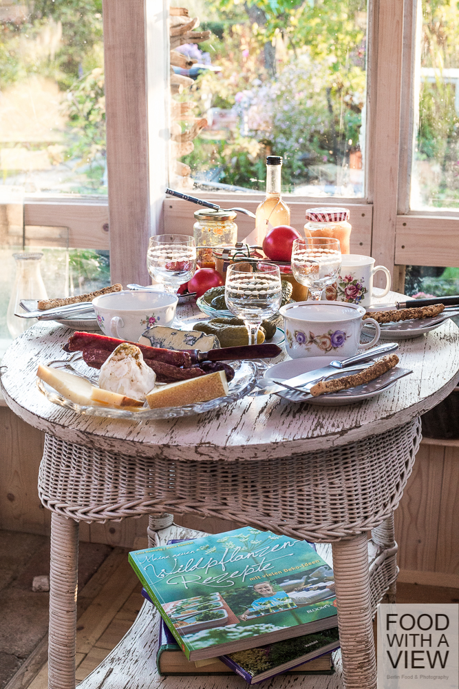 Über mein Tauschgut haben sich am Ende auch zwei Freundinnen gefreut, die zu Beginn vorbeigeschaut hatten und anschließend auf dem benachbarten Festival in einen Food-Shopping-Kaufrausch verfallen sind. Mit unseren Schätzen der neuen und der neuen alten Ökonomie sind wir in den Zauber-Garten geradelt, den aufmerksame Leser dieses Blogs ja bereits kennen. Dort hatten wir das feinste Stadt Land Food Abendbrot, das man sich denken kann, gemeinsam bei Sonnenuntergang im muckelig warmen Gartenhäuschen. Am folgenden Sonntagmorgen wollte ich eigentlich noch einmal kurz losziehen zu Käse-Workshop & Co., aber ein Kratzen im Hals und Gliederschmerzen verhießen nichts Gutes. So blieb es bei Ingwer-Tee und Kürbissuppe mit Deckchen auf dem Sofa, Slow Food im wahrsten Sinne des Wortes. Es hat geholfen: Die erste Herbsterkältung scheint erst einmal abgewendet, und die nächsten Events stehen schon vor der Tür.