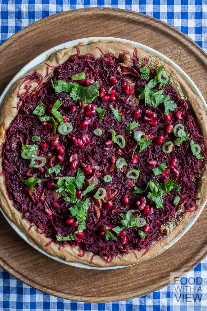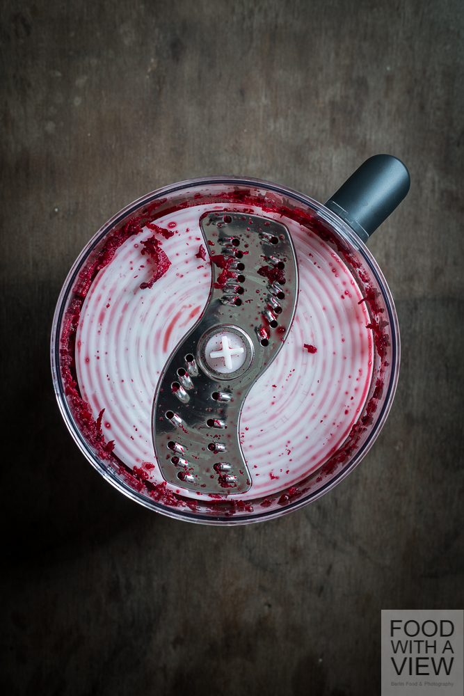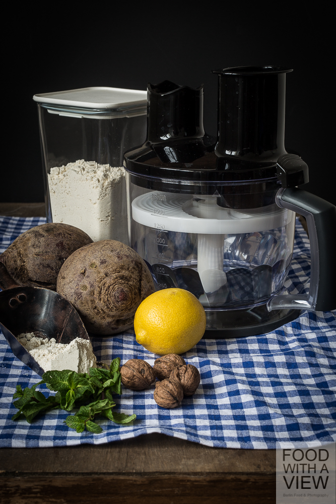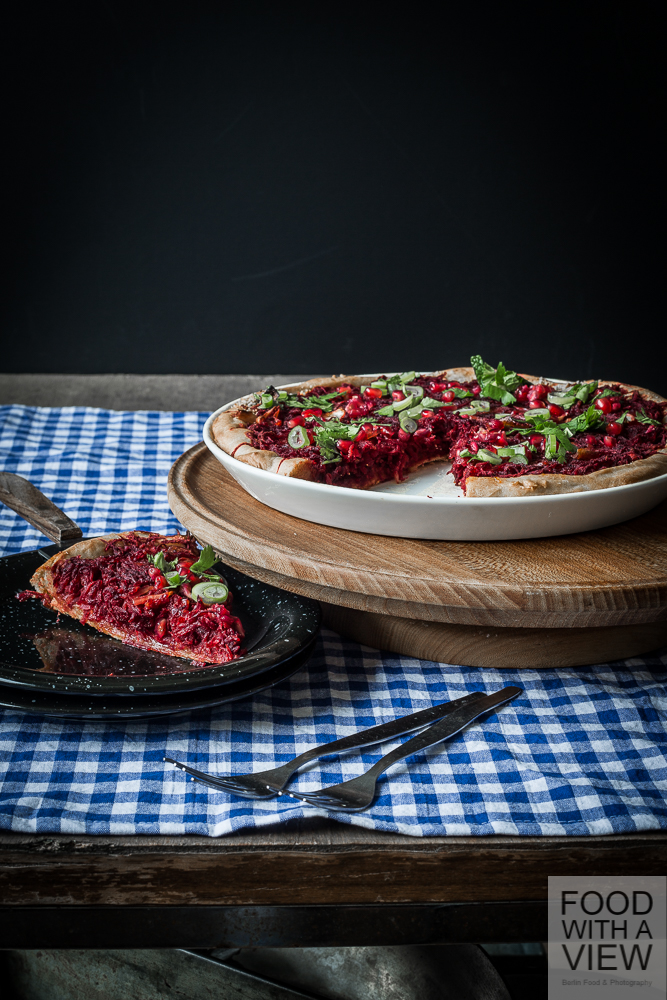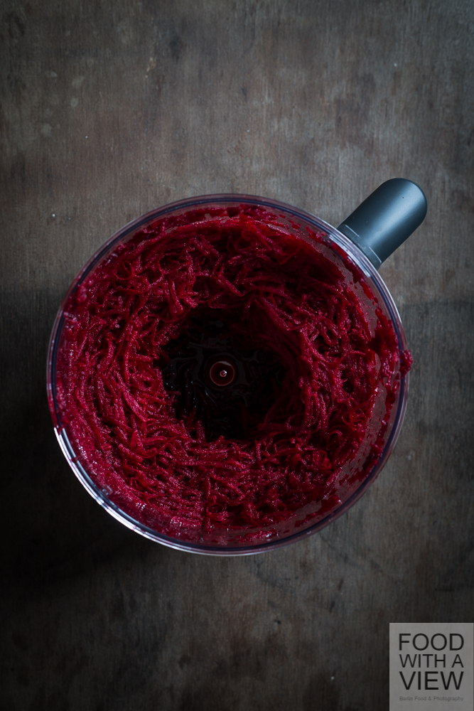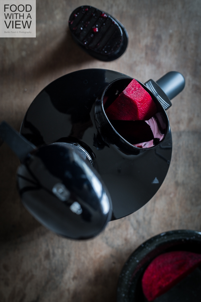 When it comes to baking in winter, it’s all about cookies and gingerbread, isn’t it – or it’s about winter vegetable tartes because they are perfect treats to test both the grating and the kneading feature. Since I relapsed regarding sore throat, I still enjoy mainly soups and purees of any kind, but I felt a desperate need to finally prepare something else (at least for a little bite) and loved the idea of beetroot tarte with chermoula, a spicy African paste. Normally, me and beetroot are not best friends, but I love the color and currently I really like its consistency and even the taste – and I haven been curious how the paste’s spices would match. I prepared the latter far less hot than the recipe demanded and I used a softer quark & oil dough instead of crisp short pastry which is often used for tarte.