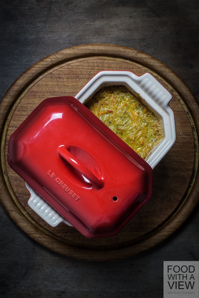 But before all these wonderful things will happen with buds and birds and birthdays and before we will all happily plunge into a sea of spring veggies, I wanna say farewell to one of my most beloved vegetables, the wonderfully orange-blushed Hokkaido pumpkin. Actually, season is kind of over already, but since these fellows can be stored so well you might be lucky to still find one at you farmer market. Be quick – the terrine I want to suggest today tastes only half as good as it actually does when temperatures outside will rise. By the way, I prepared it in a most lovely dish that I got as a Christmas present by Arne’s family. It was a dream come true since I wanted to have a Le Creuset terrine dish since a long time – and no, they don’t pay me for saying this ;-).