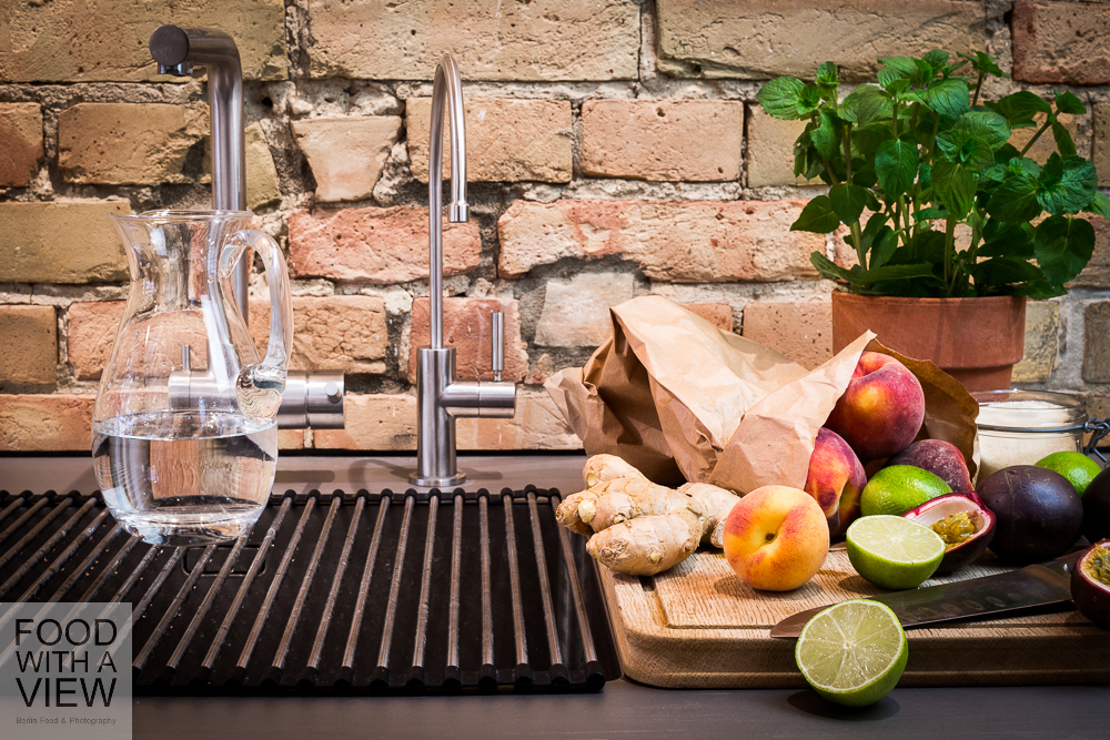 Today, it’s not us who prepare the drinks but it’s Thomas and Antje who start to cut the peaches and chop the ginger right-away while we take pictures – and of course, we talk about water. There’s a lot to say about it, and we are most interested in the topic of water filters. Tap water in Berlin is considered to be very good, however there might be issues depending on local water pipes for example in old buildings. “It’s always the same approach: the most important thing is to have access to things at all, like drinking water, and then you can think about improvements”, says Thomas. Meaning: Leogant offers special filters that get fixed to the tab or a come in a mobile version and are supposed to further reduce its content of heavy metals, medical residues, and many more substances.