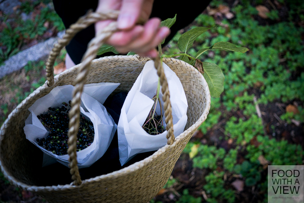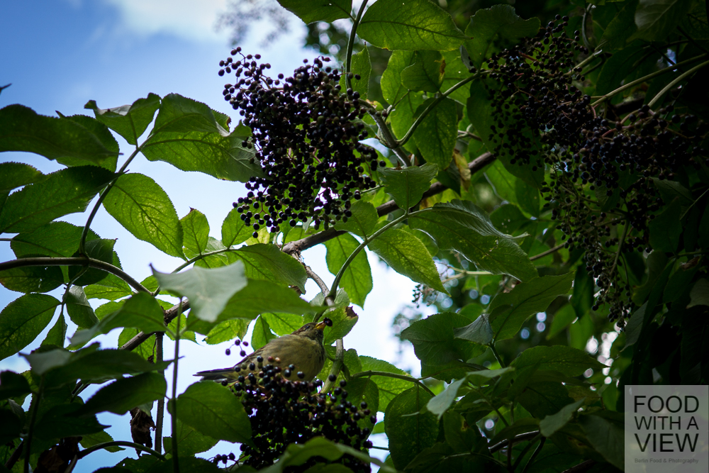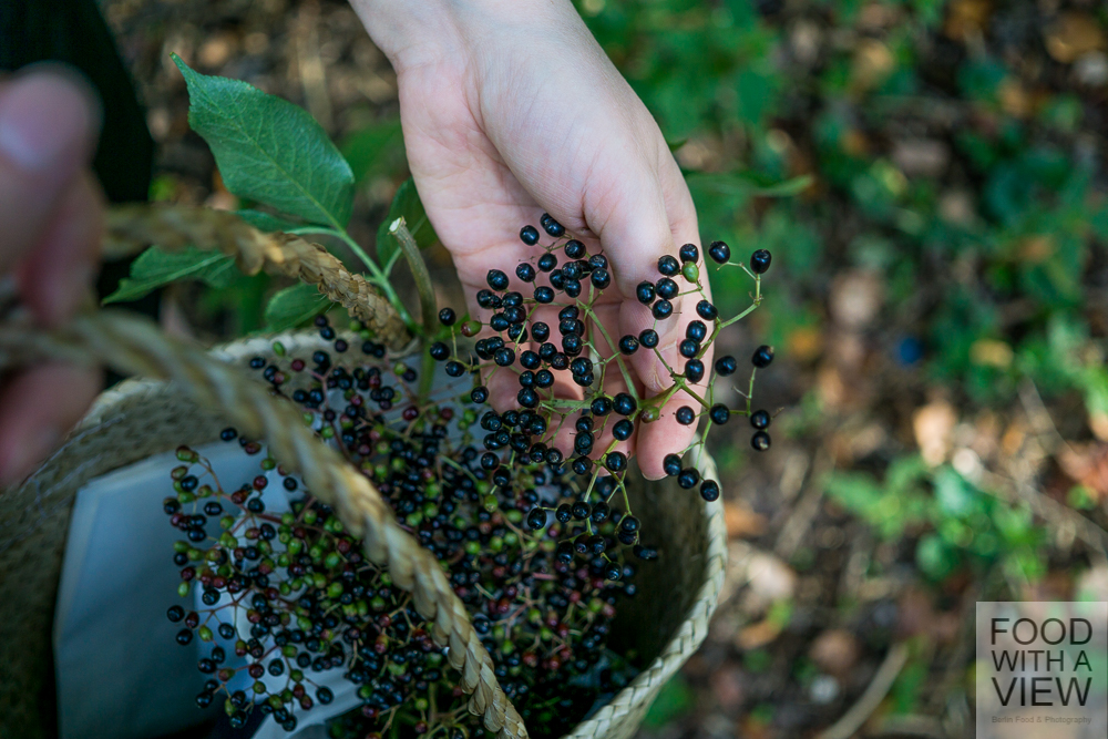 When we picked the elderberries, we had a nice little encounter with a sparrow, by the way. That little fellow was in elderberry paradise, hopping from twig to twig very close above our heads, sucking the berries and letting fall the once empty shells right on our heads. When the bird was done with its meal, he thoroughly cleaned its juicy beak against a twig – so cute. A moment that remembered us how important it is always to leave some fruit in trees and bushes when doing wild harvesting (which is quite easy when it comes to elderberries – the upper ones for the birds and the lower ones for us).