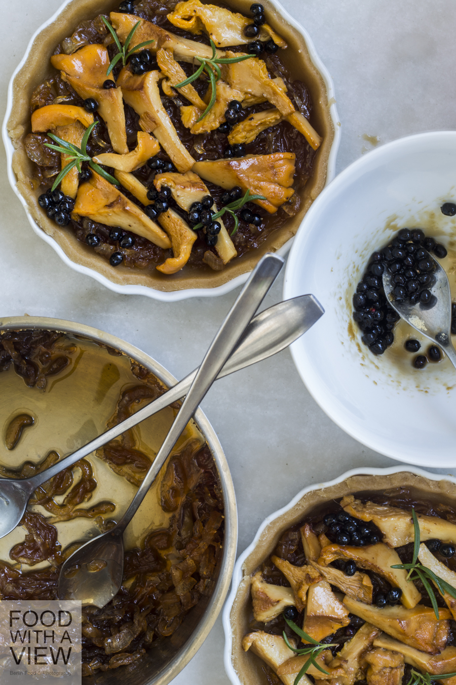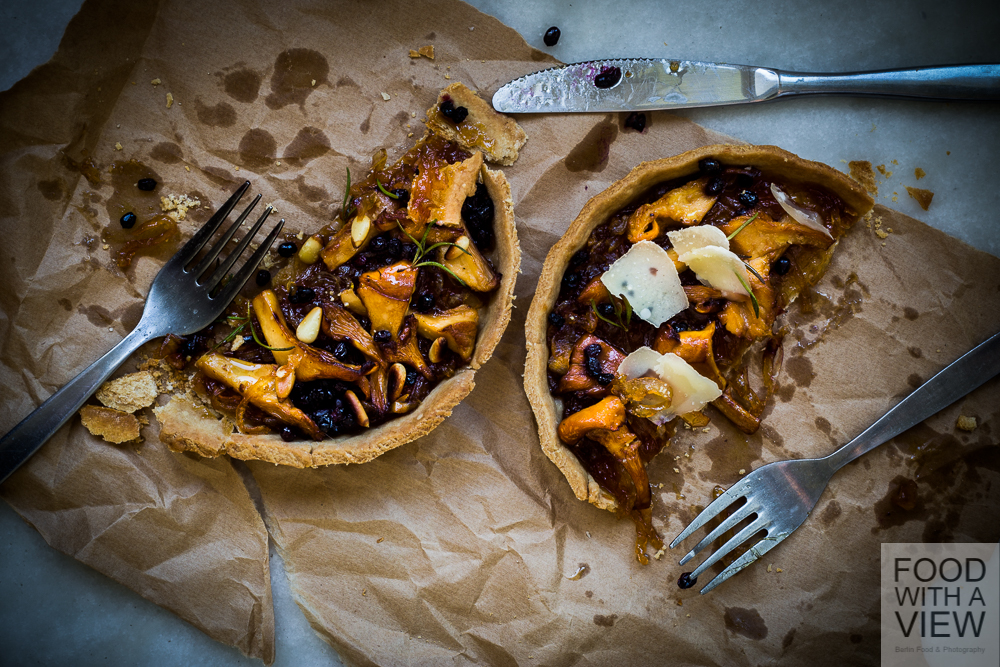 Und so bin ich schnell zum Gemüsehändler geflogen, während Arne schon mal alles zum Fotografieren vorbereitete. Inspiriert von Virginie Besançon Sonnenküche (einem meiner Alltime Favourites, den auch Arne sehr mag), haben wir uns schließlich eine provençalisch angehauchte Variante zusammengesetzt. Mit Olivenöl im Mürbeteig, Zwiebel-Konfitüre mit Holunder-Essig als Unterlage und natürlich Rosmarin vom Balkon. Die süßlich-würzige Marmelade trifft dabei auf erdiges Pilzaroma und die Beeren geben einen tiefen Ton dazu. Pinienkerne für den Herrn und Parmesan für die Dame haben das Ganze abgerundet. Double happiness – nur leider viel zu wenig davon, so ein kleines Tartelettchen ist ja schnell verputzt…