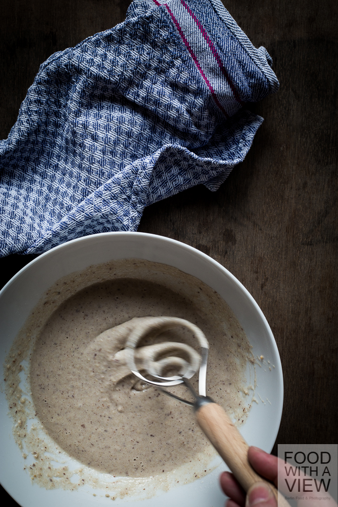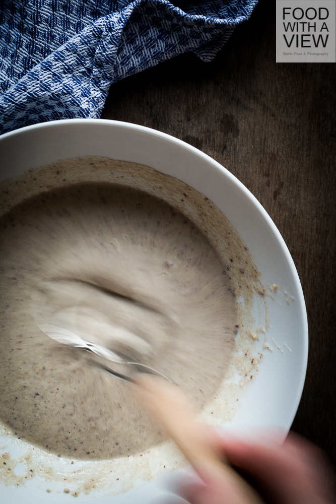 For the pancakes, mix all dry ingredients, then carefully fold in the rice milk. Grease a big pan with coconut oil, bring to medium heat and separately pour four tablespoons of dough for four pancakes. Add a little sauerkaut on each pancake and softly press into the still smooth dough. Cook for about two minutes, than turn over and cook another one to two minutes “on the sauerkraut side”, so to speak. Keep warm and prepare another four pancakes. Serve the fluffy fellows along with the chutney and enjoy the nutty, sweet & sour flavors.
