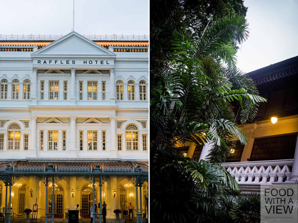 Inzwischen sind wir alle rund 36 Stunden auf den Beinen, aber der Abend beginnt gerade erst mit einer Bootstour durch die Marina Bay und zum Wahrzeichen Singapurs, dem von Touristen dicht umlagerten Merlion. Von der seidigen Abendluft auf dem Wasser bekommen Arne und ich erst einmal wenig mit. Wir überschlagen nämlich im Kopf, wann uns das dichte Programm Zeit lassen wird, die einzige mitgebrachte 5D-Kameralinse zu ersetzen, die ich Minuten zuvor im Bus in einen Totalschaden verwandelt habe – Food Blogger’s nightmare. Irgendwie brauchen wir jetzt einen Schnaps, und den gibt es glücklicherweise auch sofort im Anschluss: Es geht in die Long Bar des legendären Raffles Hotel auf einen Singapore Sling. Der berühmte Drink wird uns bereits als Ladie’s cocktail angekündigt und schmeckt ähnlich pink, wie er aussieht. Der Kamera-Unfall ist damit in milderes Licht getaucht, und dann verlassen wir den mit filmreifem kolonialen Dekor und üppigem Pflanzenwuchs charmierenden Ort in Richtung Hyatt Hotel: Es gibt ein weiteres Mal an diesem Tag Street Food, diesmal elegant vom Buffet.