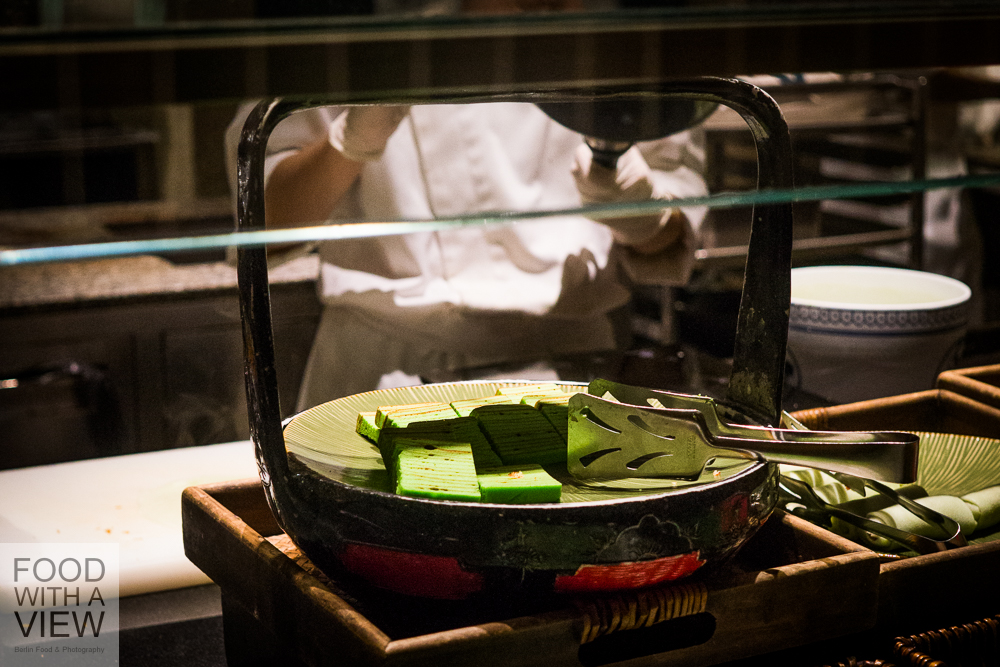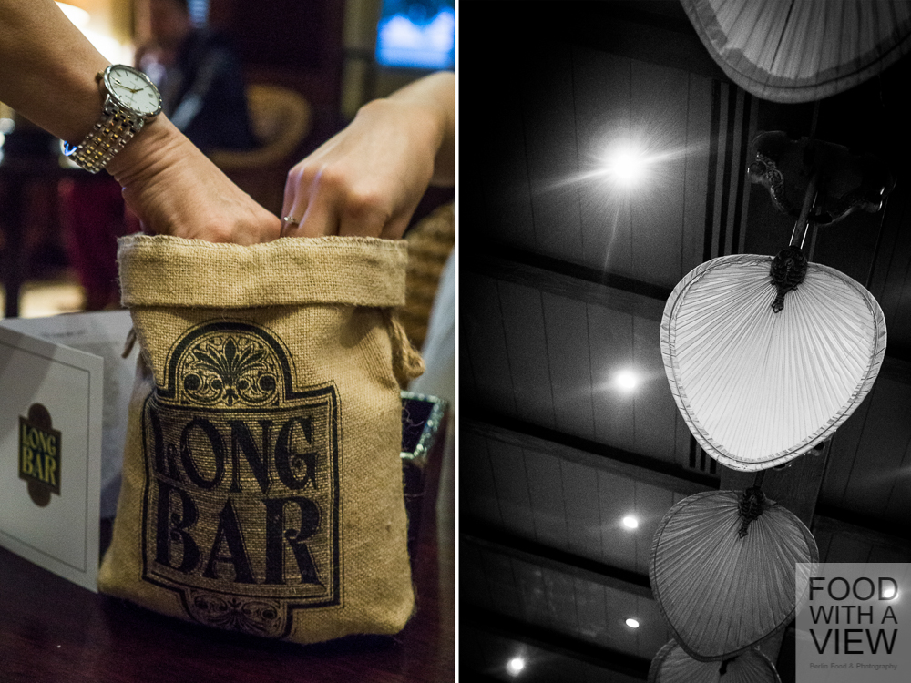 Meanwhile, we’re on our feet since nearly 36 hours, but the evening is just about to begin. We go on a boat trip to Marina Bay and the city’s tourist-crowded landmark Merlion. Arne and me realize the silky air only by far since we think about a gap in the timetable allowing us to head to a camera shop – because minutes ago on the bus, I crashed our only 5D lense at hand by accident – food blogger’s nightmare. High time for a proper drink, and fortunately, our tour’s next stop is the famous Long Bar at the likewise famous Raffles Hotel. We’re offered a Singapore Sling, a sweet and pink-colored lady’s cocktail, and the camera accident already looks much milder in this amazingly lovely tropical and colonial-style scenery. Temperatures get milder, and after our cozy aperitif, we get hungry. Lucky us: there’s a dinner buffet waiting for us at the Hyatt Hotel, today’s second and high-level street food opportunity.