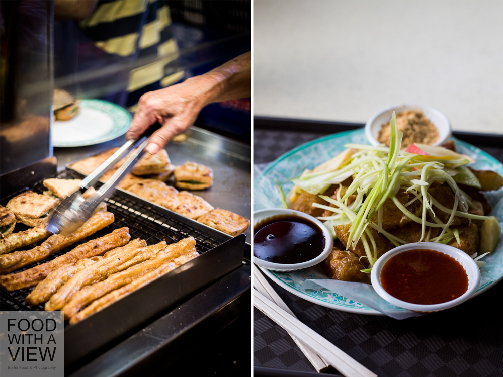 Upstairs, Joseph gives a little street food tour to our group’s special diet travelers – vegan, vegetarian, and barrier-free soft food. We soon learn that apart from labels (which are sometimes defined differently or unknown), we have many culinary options beyond meet, seafood, and dairy products, not the least due to the local Buddhist cuisine. Arne and me decide for carrot cake (a steamed radish cake that is often served stir-fried as Chai tow kway but is sometimes offered plain with just a dip) and for rojak. The latter is a local fruit salad with many delish ingredients that we cooked at home already to prepare for Singapore – and it’s great to taste the original (our recipe came quite close, thanks to some well-sorted Asia-shops in Berlin 😉 ). It’s topped with green mango instead of torch ginger, but we love it that way a lot as well.