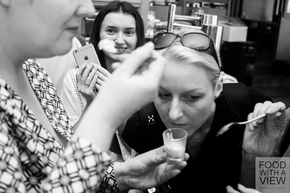 We absolutely love the Indian buffet with warm and deep-flavored curries, many fish and seafood treats on the Chinese buffet, Malayan satay, and vegetarian springrolls on demand. Arne and Lea, our vegan travelers, get a special offer with noodles and bok choy, and our Burda companion Victoria turns out to be an Asian sweets expert. We marvel at consistencies and colors, and we discover flavors of coconut and avocado, of caramel and mango and many more. A gorgeous lychee sorbet is among our favorites – and when at the end of that night we finally tasted them all, we’re back on the bus after our first day in the city of foodies.