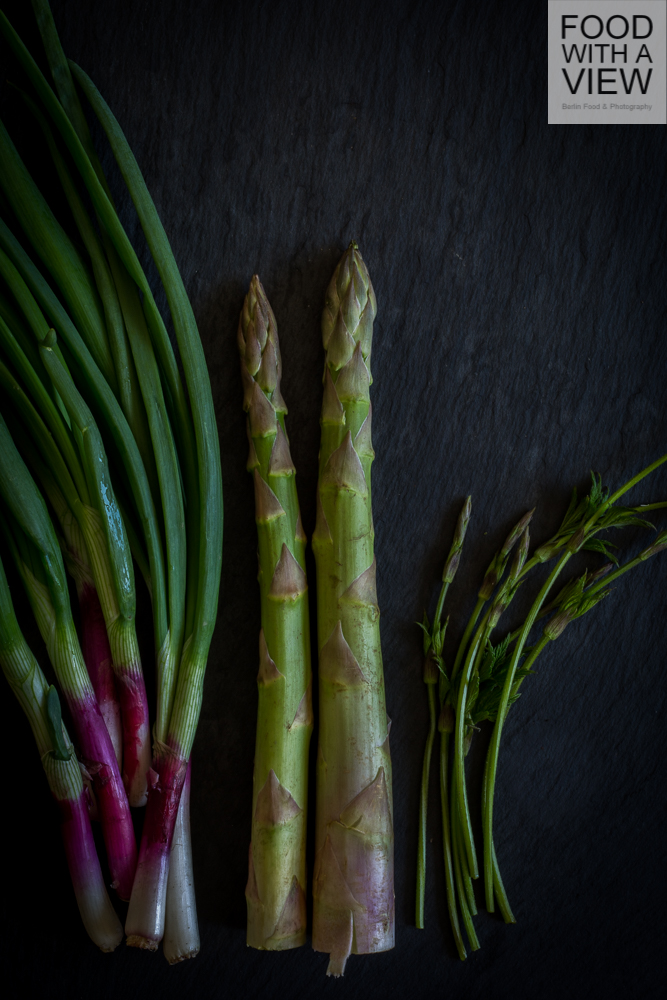 How lovely is spring in late April! Indeed, it’s still much too cold (at least in Berlin), but due to chilled temperatures, we enjoy lovely culinary coincidences. Wild garlic is still in season, winter purslane is still tasty and wild hop shoots fall into your hands everwhere around town while young kohlrabi is available on the farmer’s market, and so is green asparagus. Not to forget about so many wild herbs running to leaf… There’s of course good reason for all this green happiness since this post is our contribution to this weekend’s virtual Green Spring Dinner with lovely fellow bloggers, hosted by Marina of piroggi , Lisa and Julia of Liz & Jewels and us.
