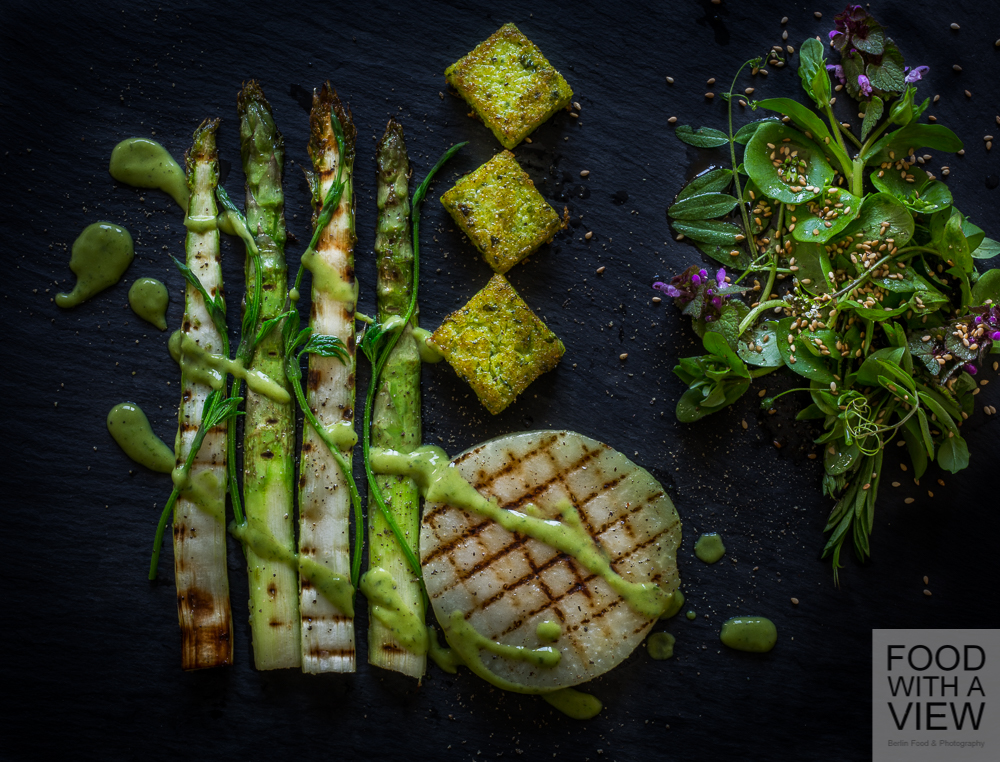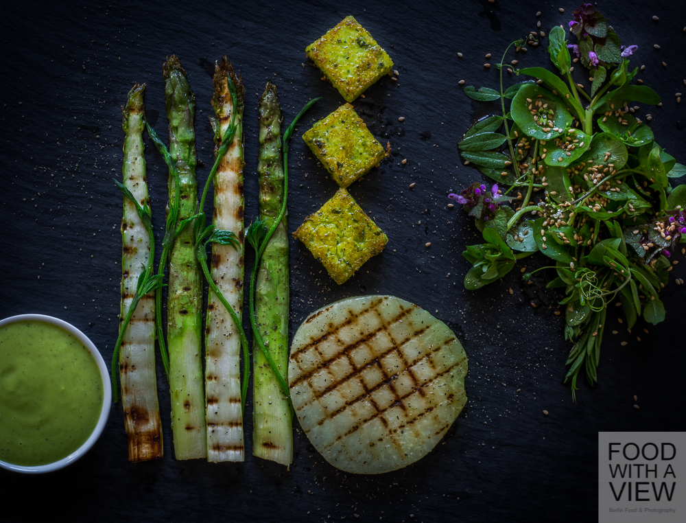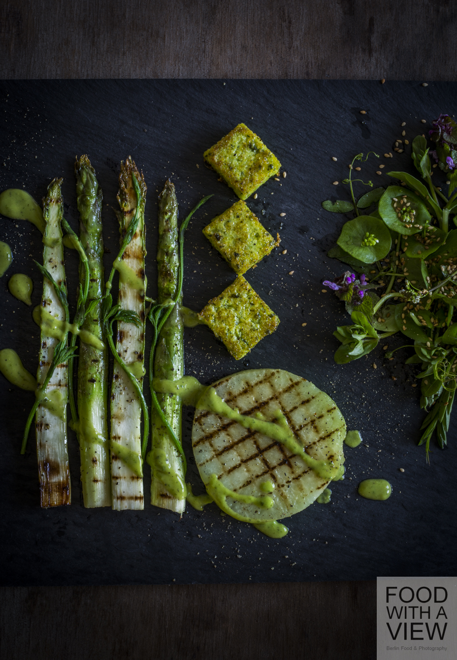 So here we go with some grilled veggies, and since it’s still much too cold outside (did we mention this already ;-)?) we were chilling rather than grilling with a barbecue pan to use on a stove. Toasting flavors go along very well with kohlrabi and asparagus, and if you miss the smoky touch, just add a little smoked salt if you like. Talking about details: It’s that time of the year when you get your roots and tubers with green leafs again, thus we made use of the kohlrabi leafs also. And when it comes to plating, geometry and wild nature inspired us this time – the veggie’s special shapes call for this somehow, don’t they.