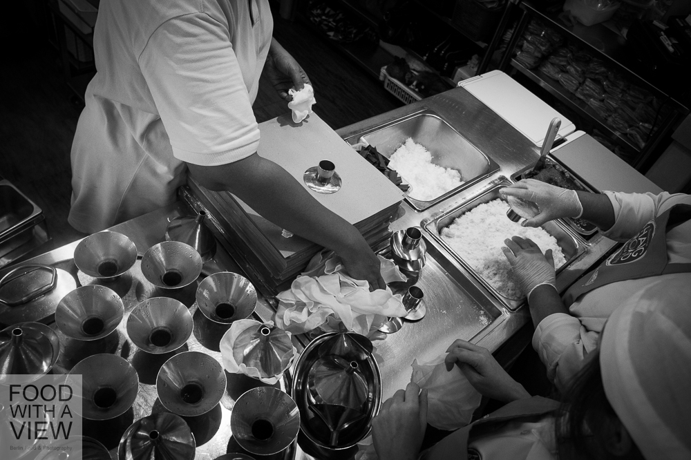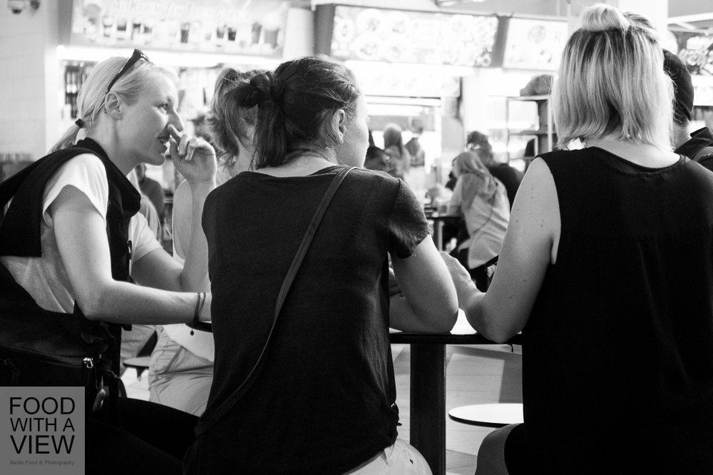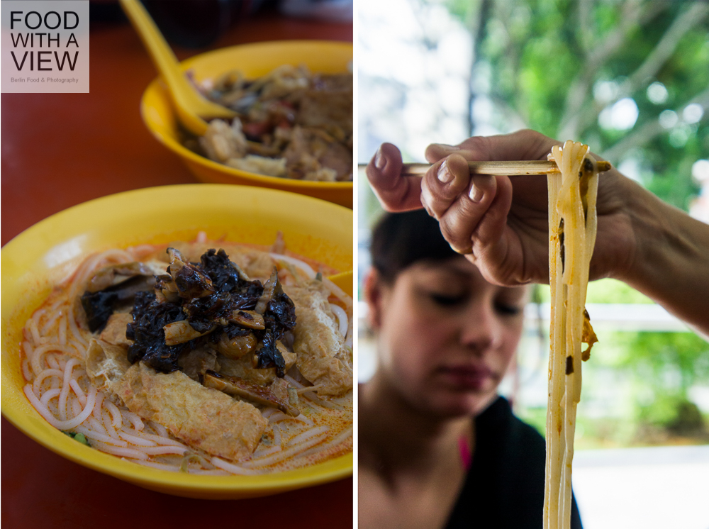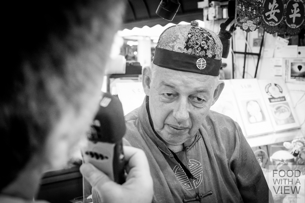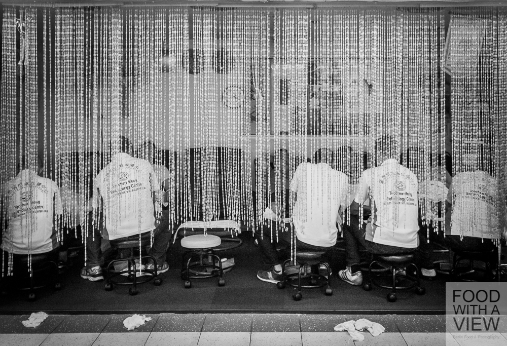 In the meantime, we’re right in the middle of the daily afternoon heat, and even all that teh tarik and kopi that we had just moments ago can’t keep us from getting a bit tired. We get a lift to Chinatown to take a look around on our own, and together with Silke of Fräulein glücklich and Claudia of Geschmeidige Köstlichkeiten we are looking out for one of these nice little cafés half-hidden in one of these lovely arcades to just chill a bit. The day before, we were passing by some of these places so many times but can’t find again now. What we do find along the way is a shopping center with lots of foot reflexology lounges – how great an idea, but unfortunately we’re running out of time. We finally meet the second half of our group along with our SingExpress travel guides Eunice, Ignatius and Joseph at Chinatown’s maybe best known expat Erich who runs the Austrian sausage stall Wuerstelstand.
