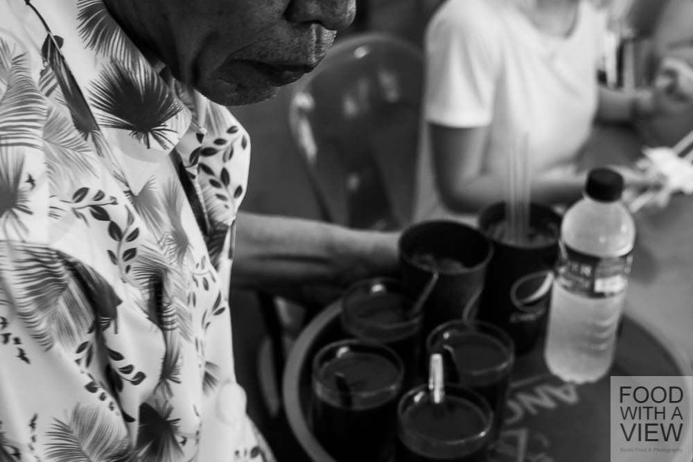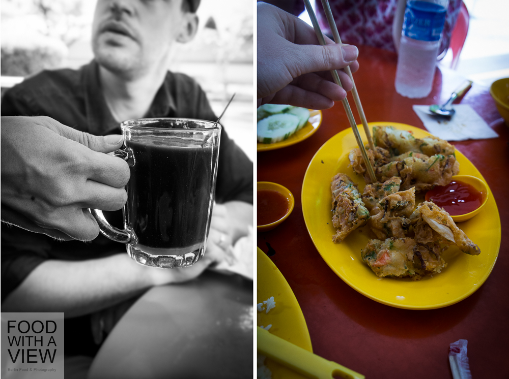 By now, we wouldn’t say that we’re hungry any more – many of the local street foods are based on carbs and we’re quite replete in the meantime. But there’s that little café Café Alwadi on our way to our next stop, and we take a break to try the local delicacy putu piring. The steamed rice flour cake’s preparation in little metal bowls is most eye-catching, and so is the rustic presentation on paper. The taste is awesome: in between the cake’s warm layers, there’s caramelized palm sugar, all of this dipped in coconut flakes – it’s heaven. Along with it we have again some the tarik or iced kopi that Arne discovered on our first day and is fond of ever since, and all told it’s a great little Malay coffee break.