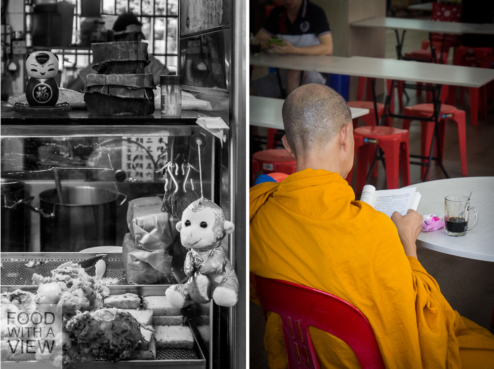 Just a few steps off the beaten track, Singapore shows another fascinating facet with houses that are less tall as well as shops and restaurants that seem to be frequented by locals rather than by lots of tourists. We start at Kwan Inn Vegetarian Food, a lovely place run by Madame Choo. This early in the morning, just a few tables are already taken by families from the neighborhood at some Buddhist monks, and we enjoy a fresh breeze since – like most hawker centers – the location is roofed, yet built open-air. Then we get started: Madame Choo and Maureen offer us Chinese noodles lor mee in a tangy sauce and a vegan variety of the popular and quite hot laksa-soup from local Peranakan cuisine. It’s normally prepared with fish and seafood, but we enjoy a delish version made with tofu and mushrooms. Next, there’s crispy fritters with a chili dip and of course “no chicken rice”. The dish is among the iconic Singaporean dishes, and for our veggie group, it comes with some adorably crispy tofu skin instead of meat. We had a second-hand knowledge of this already and now find approved, that these and many other soy and mock meat products are not considered substitutes but have a long culinary tradition often rooting in Buddhist nutrition habits. We’re fascinated with the many different consistencies – and not the least with the orange colored tables and the yellow plates. It’s quite a challenge when it comes to food photography, but the look is indeed sunny and friendly ;-).