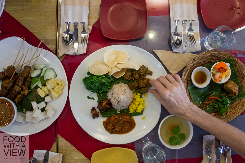 One of the latter is the Singaporean store of the international vegan restaurant chain Loving Hut with local as well as East-Western crossover dishes on the menu. We’re seated at a long table and again a great variety of treats is offered to us. Like this morning already, many of them are based on tofu and soy, and again that crispy tofu skin is just delish. There’s spicy noodles char kway teowon our plates, as well as satay with peanut sauce, assorted vegetables, and nasi campur, a rice dish with many different and delish sides. We have a little chat with our host and while he presents the place’s up-cycling furniture, we learn that topics like organic foods and sustainability aspects are important to him as well. We like the concept – and then it’s time for our guide to leave. It had been a wonderful forenoon with much inspiration to further explore this part of town on the very next occasion. Thanks a lot again to Maureen! We still remember having breakfast together at our friend’s garden in Berlin in October and talking about the do’s and don’ts of a vegan diet. A strictly vegan Singapore food tour might be quite a challenge for her, that’s what she said back then – very well done, that’s what we say now :-).