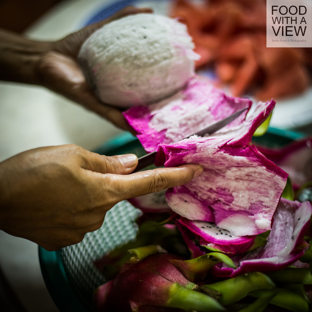 Because this will be the last night of our journey’s official part as a group – time to celebrate together. We start the night with an invitation to the private place of Eunice and her husband who – like many Singaporeans – live in a so-called housing & development board apartment. But not many such apartments will be like this place: indeed, it’s kind of a museum furnished with most lovely Chinese and Peranakan antiquities. It’s all eye candy – and it will be followed by further delights. The dinner starts with delicious home-made spring rolls that we prepare ourselves at table, and later that evening, we are served with vegan bihun noodles, fresh dragon fruit and sorbet as well as jack fruit ice-cream. We enjoy the food, the private atmosphere and Eunice’s warm hospitality a lot – it’s a special night and an honor that we all will remember.