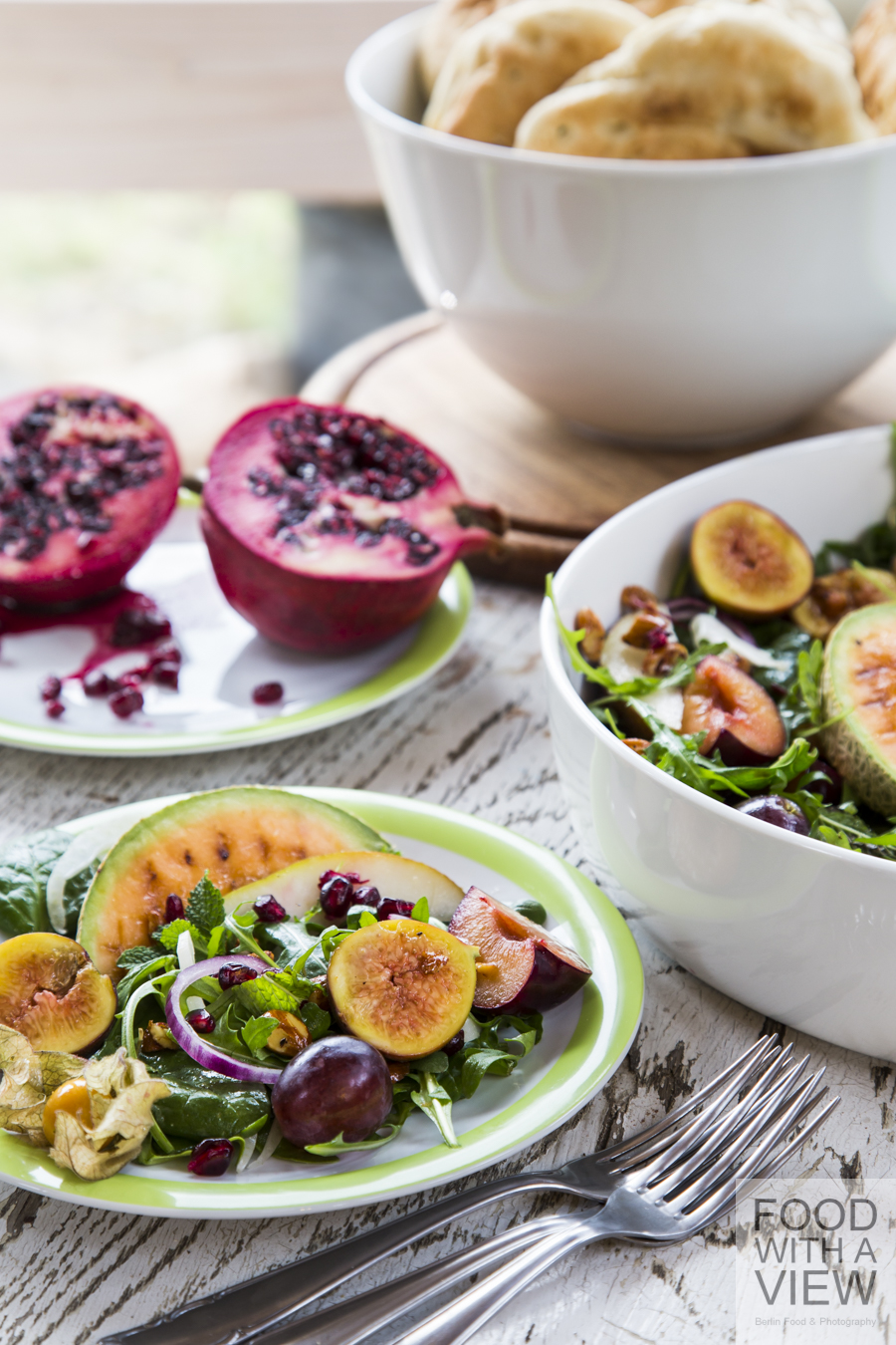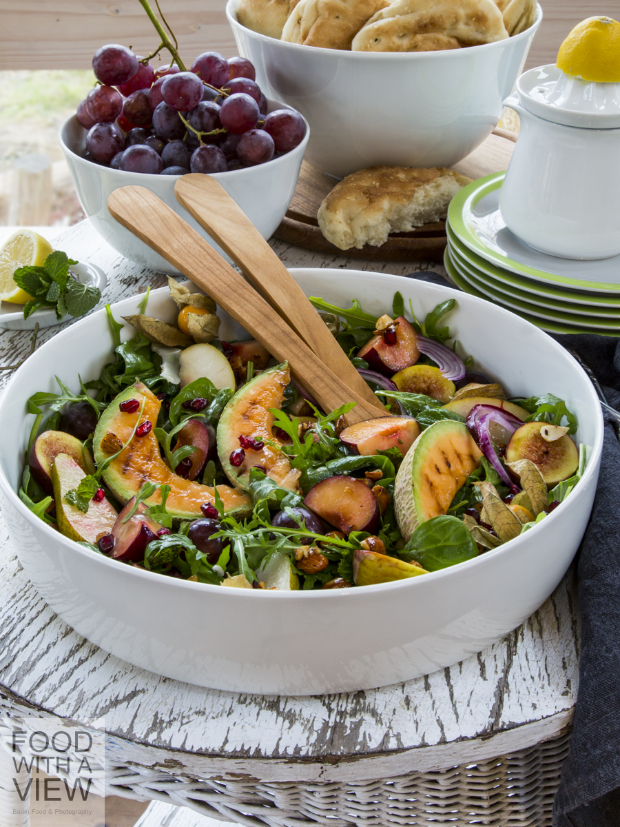 It’s finally summer, and we couldn’t be happier about it. This is the time of the year with a great variety of crops and fruit out there on the farmer markets and in your own garden or balcony. And even though we’re a little sad that our raspberry bush on the balcony didn’t even bloom this year (not to talk of being in fruit), we enjoy all these cherries and berries and much more fruit on our plates. Indeed, what belongs to summer as much as fresh fruit does? Ok, there’s barbecue, not to forget. So, why not having them both in a fruity summer salad with grilled melon to have at home for summer dinner or by the lake side after swimming or at a picnic. At least we do hope that there will be lots of opportunities to enjoy all these summer pleasures within the next weeks.