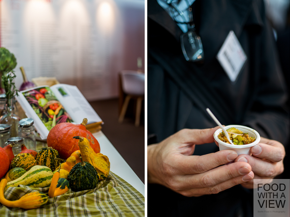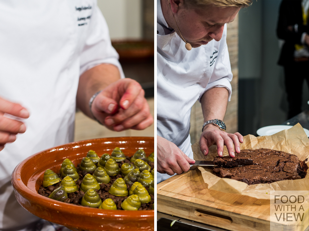 We’re here to watch the cookery show of Seppe Nobels, one of 25 so called Flanders Kitchen Rebels. In Antwerp, he is running the restaurant Graanmarkt 13, and French restaurant guide Gault Millau calls him one of the best vegetable chefs in the world. Do we need any more reason to look forward to his performance? We don’t, and when Nobels starts to talk about his philosophy of seasonal cooking with local ingredients (partly from his own roof top garden), we totally agree. Today, it’s all about pickling and marinating, about beetroot, both red and yellow, small radishes, herbs, and mustard, a product used a lot in the region. Many people might think of chocolate rather than root veggies when it comes to famous Belgian treats, and Nobels has good news for them: “Of course, there will be chocolates and a chocolate tart as well” he promises with a smile. Within the following hour and along with his assistant chef, he creates a little menu full of flavor. Besides some cream cheese it’s all vegan – from varieties of pickled roots, topped with herbs, mustard seeds and garlic oil up to pralinés and lukewarm chocolate tart with saffron & vanilla ice cream. Of course, it’s all delicious, and an insight into Nobel’s books “Greens that taste like friendship” and “Vegetables that Sparkle the Conversation” is most exciting. In the end, we have a little talk together about oven veggies in a salt crust and about the fun & challenge of vegan or gluten-free cookery in high-end cuisine – it’s all just a question of creativity.