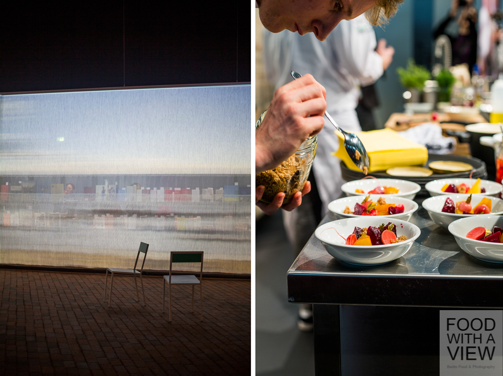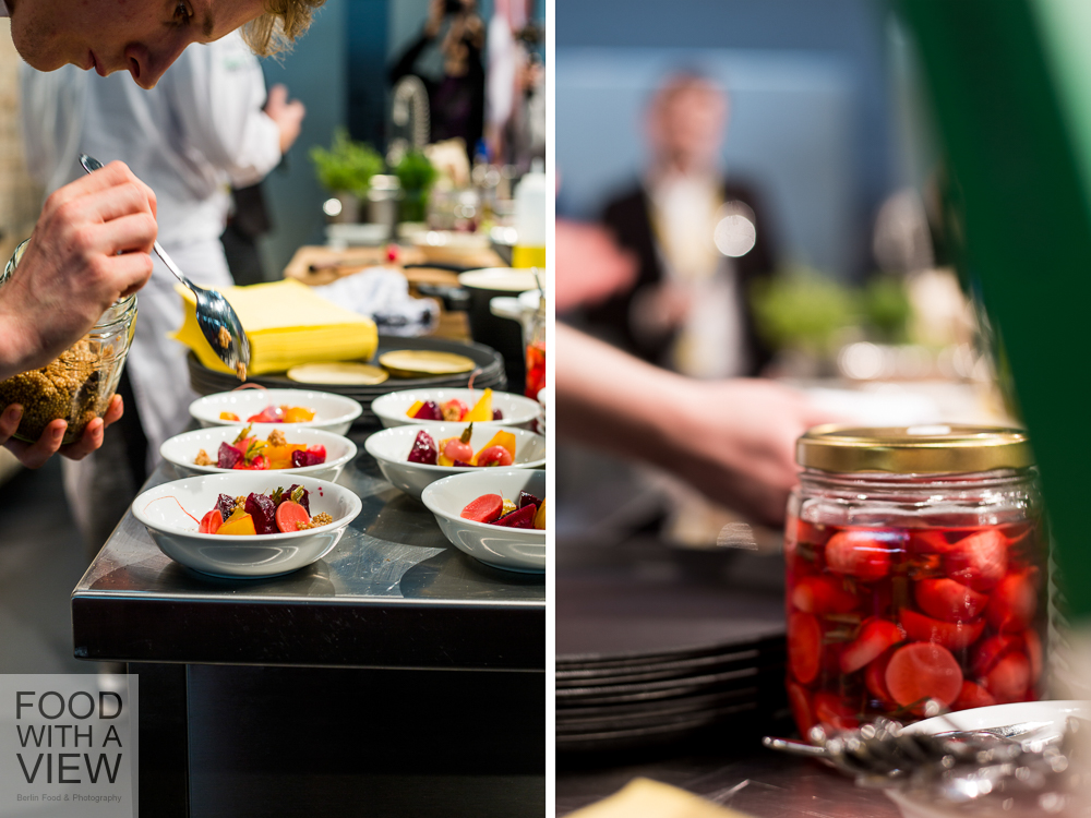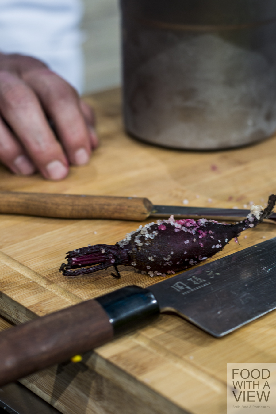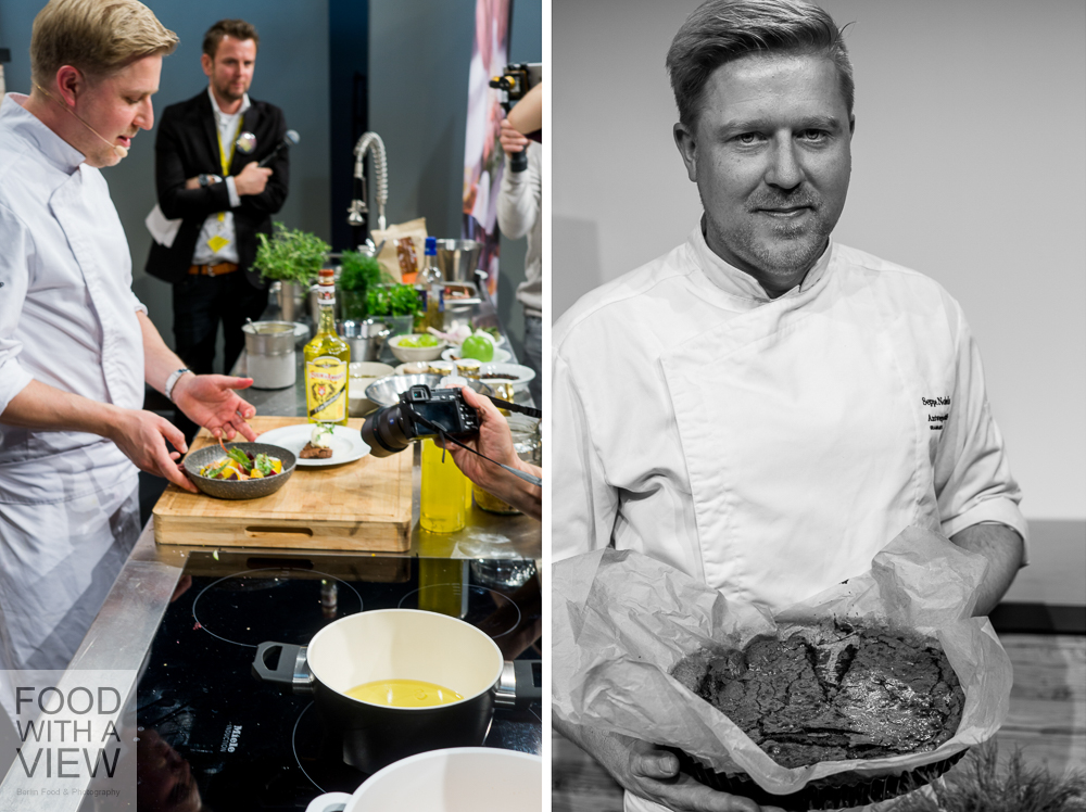 Er zählt zu den 25 sogenannten Flanders Kitchen Rebels, betreibt in Antwerpen das Restaurant Graanmarkt 13 und wird vom Gault Millau als einer der besten Gemüseköche der Welt bezeichnet. Grund genug also für uns, brennend interessiert zu sein. Nobels leitet seine englischsprachige Show mit ein paar Worten zu seiner Philosophie des Kochens mit regionalen Produkten ein, die teilweise aus seinem eigenen Dachgarten stammen, und wir können alles, was er dazu sagt, nur unterschreiben. Um’s Einmachen und Marinieren soll es heute gehen, und um Radieschen, Rote & Gelbe Bete, Senf und Kräuter. Wer im Publikum bei Belgien eher an Schokolade als an Wurzelgemüse denkt, auch für den ist Nobels vorbereitet: “Natürlich habe ich auch Pralinen und eine Schokoladentarte mitgebracht”, sagt er mit einem Schmunzeln. Und so entsteht vor unser aller Augen im Laufe der nächsten Stunde ein Mini-Menü, das vor Aromen nur so strotzt. Bis auf die Quark-Basis für die mit Knoblauchöl, Senfkörnern und frischen Kräutern getoppten Rübenvariationen ist alles vegan bis hin zu einem Vanille-Safran-Eis zur erwähnten lauwarmen Schokotarte. Alles ist absolut köstlich, und die Neugier auf Nobels’ Bücher mit den schönen Titeln “Greens that taste like friendship” und “Vegetables that Sparkle the Conversation” ist nachhaltig geweckt. Im Anschluss plaudern wir noch ein bisschen über Ofengemüse in der Salzkruste und darüber, dass Nobels einfach Spaß daran hat, sich auf vegane Küche und auf spezielle Bedürfnisse zum Beispiel von Allergikern einzustellen – alles eine Frage der Kreativität.