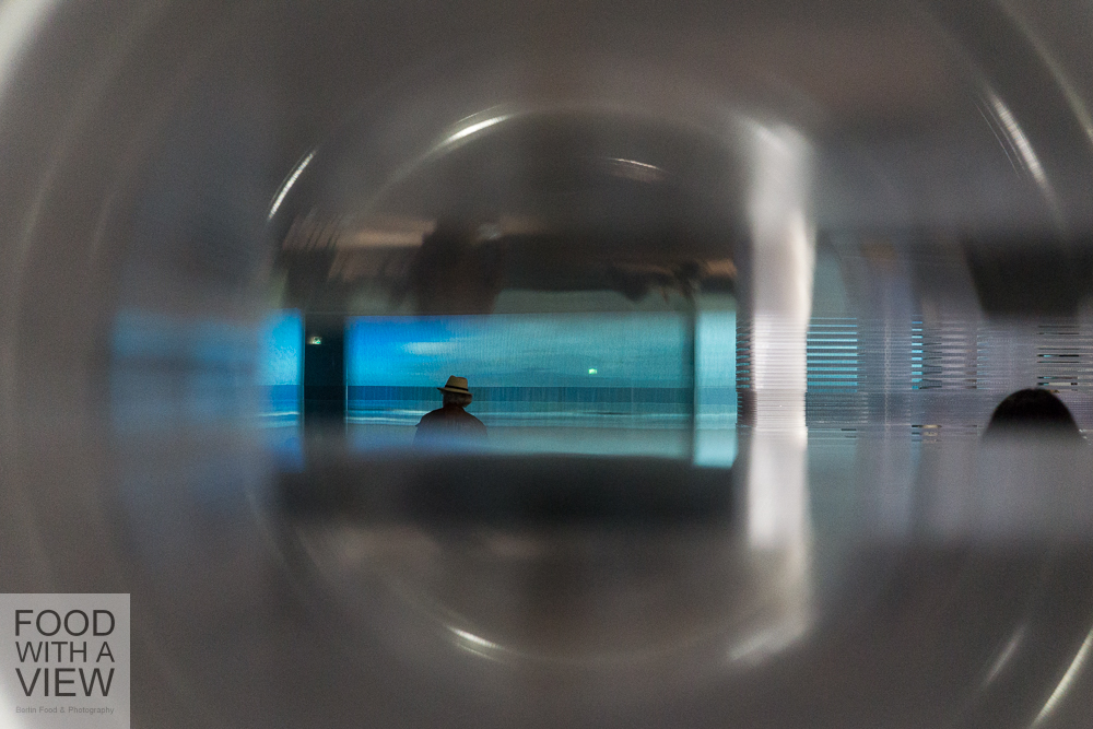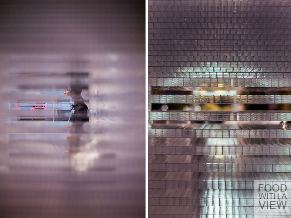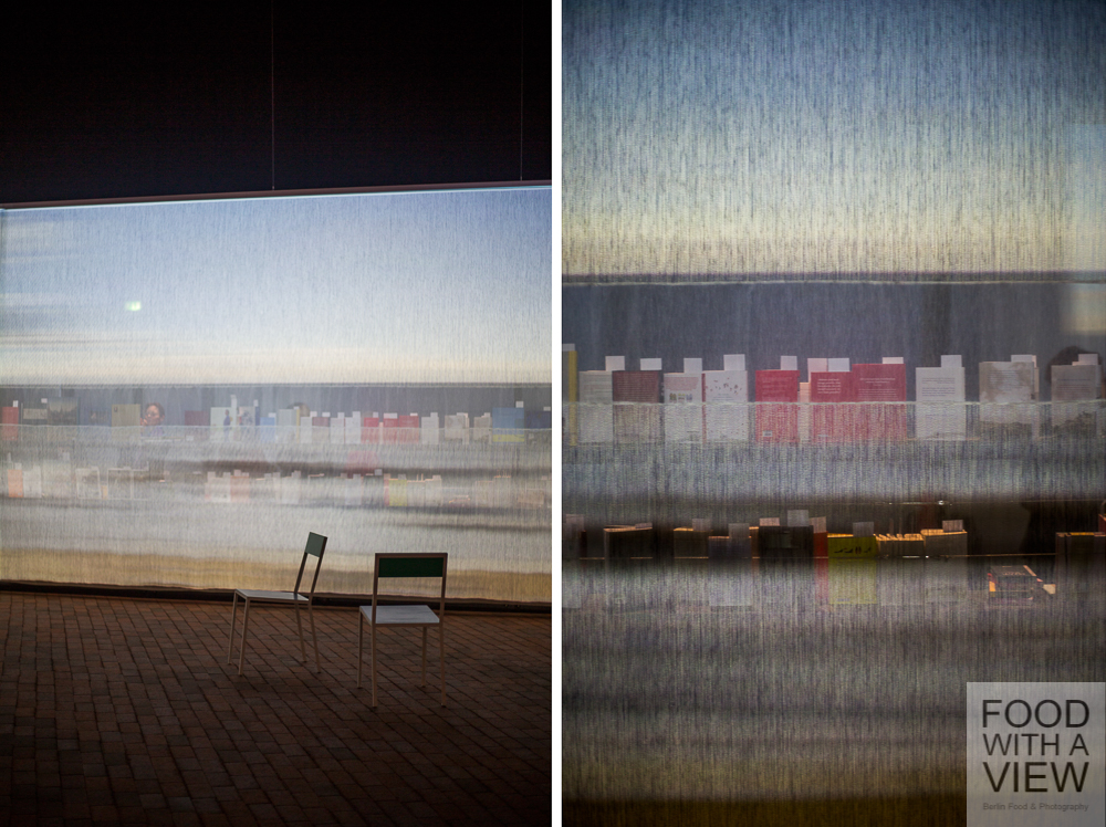 Each year, another country or region is the bookfair’s guest of honour, and this year it’s Flanders & the Netherlands with the slogan “Dit is wat we delen” (This is what we share). We always love to start our book fair visit at the pavilion designed by the subjective guest, and this is what we did this year, too. Entering the twilit room, the first thing that catches our eyes is a light projection in the back of the room with waves and beach chairs, so it seems. When approaching, you recognize that it’s book shelves indeed, hidden behind walls of gauze. In contrast, big cubes spread across the place and containing a shop, a cinema and many more things allow insights with most interesting light and color effects. We’re amazed with the design and the idea of clear width, transparency, and geometry.