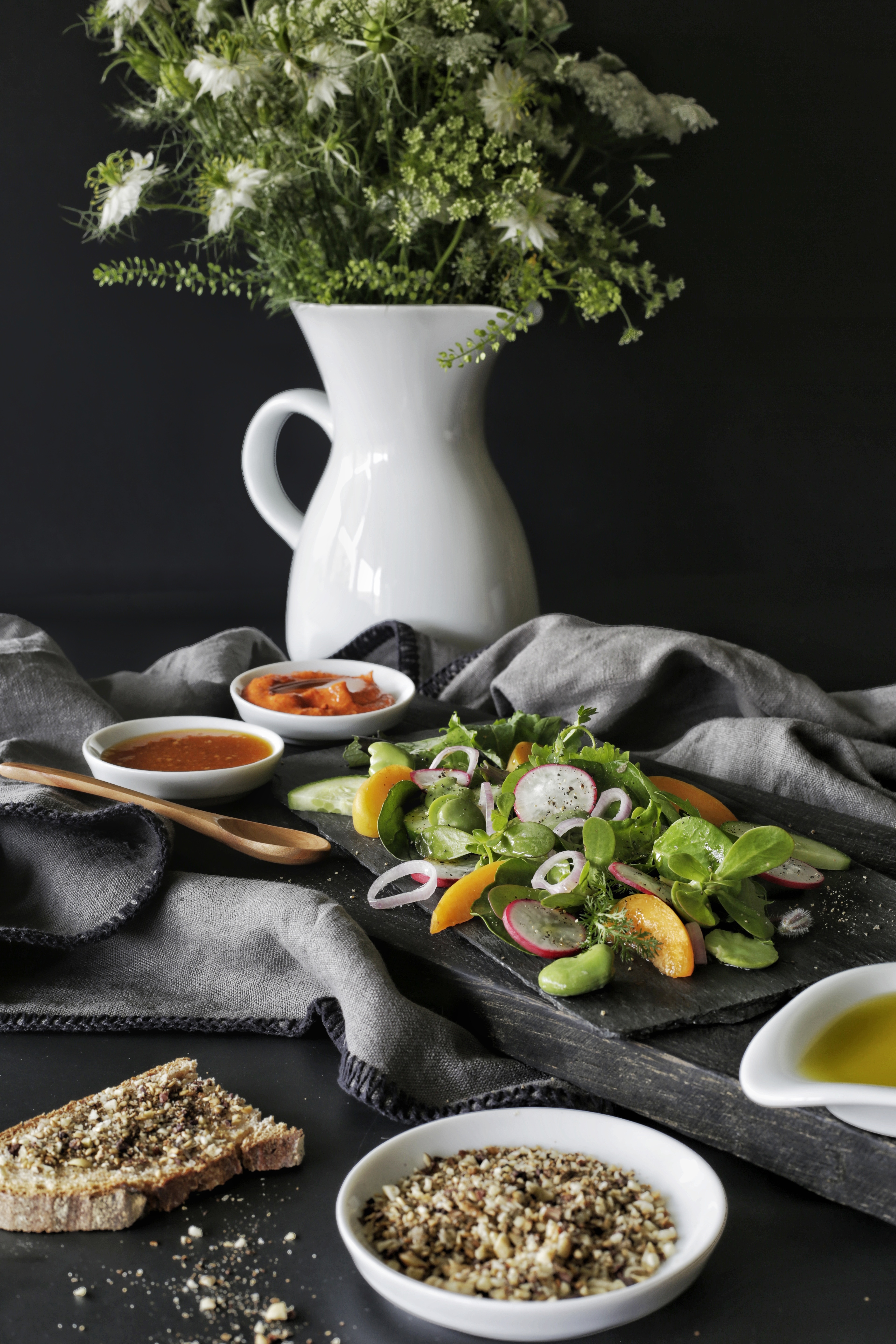 For the dressing, mix all the ingredients with a whisk. Arrange all salad ingredients on two lovely plates and drizzle with the dressing. Serve with some dips of your choice and offer some baguette and olive oil along with the dukkah.