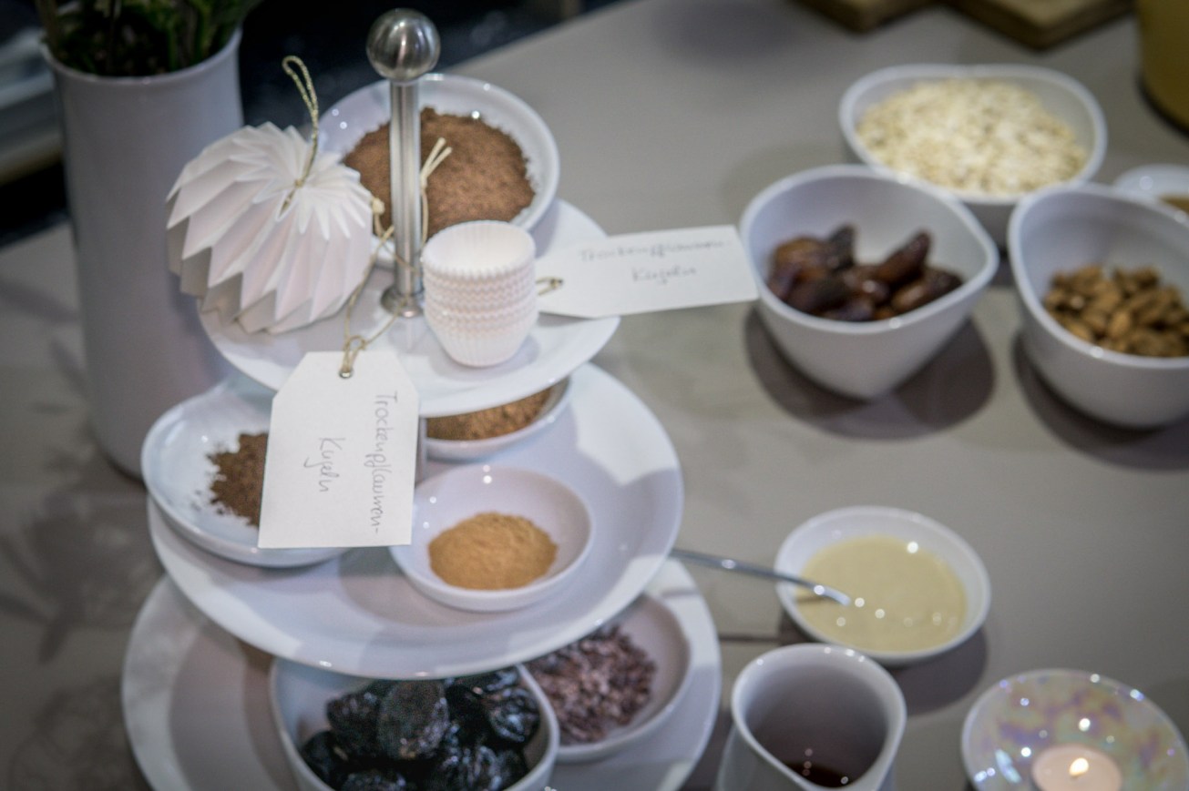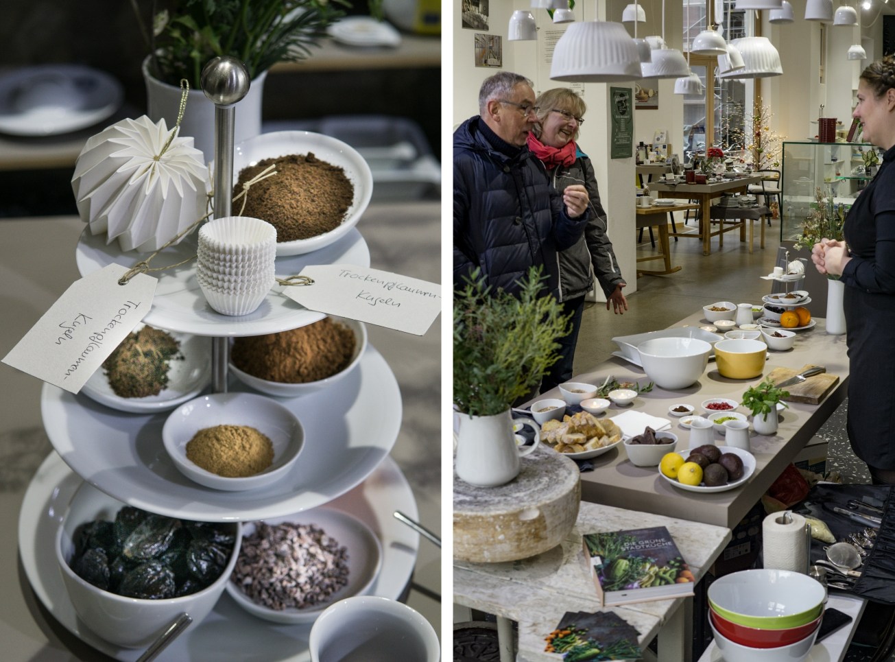 This year, Advent time is even more special to us since we look back on a year where our life has been much involved with our book Die grüne Stadtküche. On several occasions, we were so lucky to be invited to introduce some of its delicacies which was always so much fun and meant a lot of wonderful encounters. An especially lovely occasion has been an invitation to last Saturday’s start of the KAHLA point of Brand jubilée week in Berlin, a location that we like a lot and also chose for our book launch party in July early this year. This time, it was all about Christmas trees and champaigne, and we added some sweet treats to it with tarte and pralinées along with some cocoa dukkah to celebrate the anniversary. Thanks a lot to our lovely hosts for celebrating the First Advent weekend with us :-). Find some impressions below…