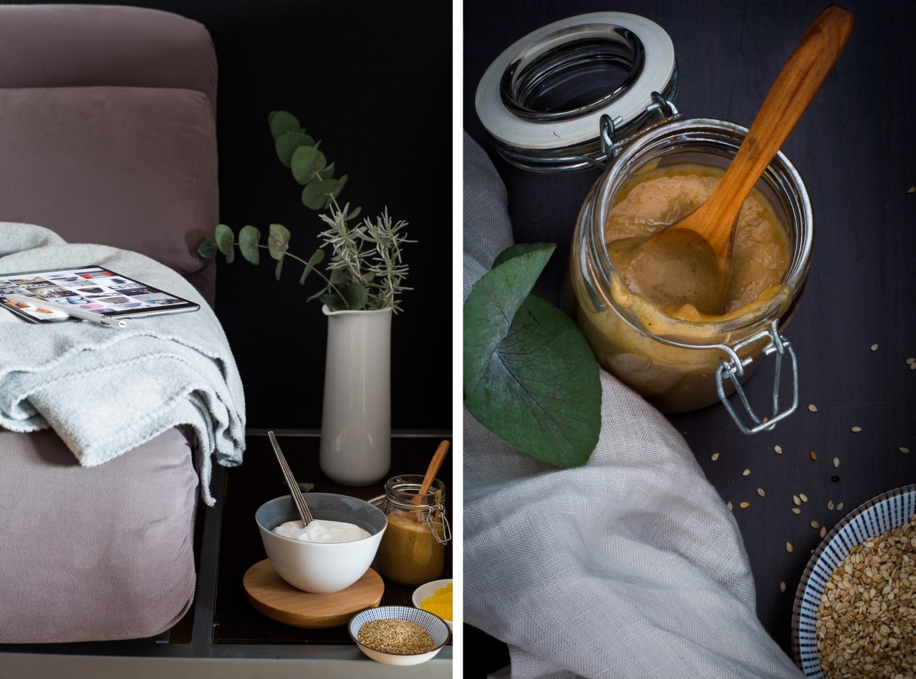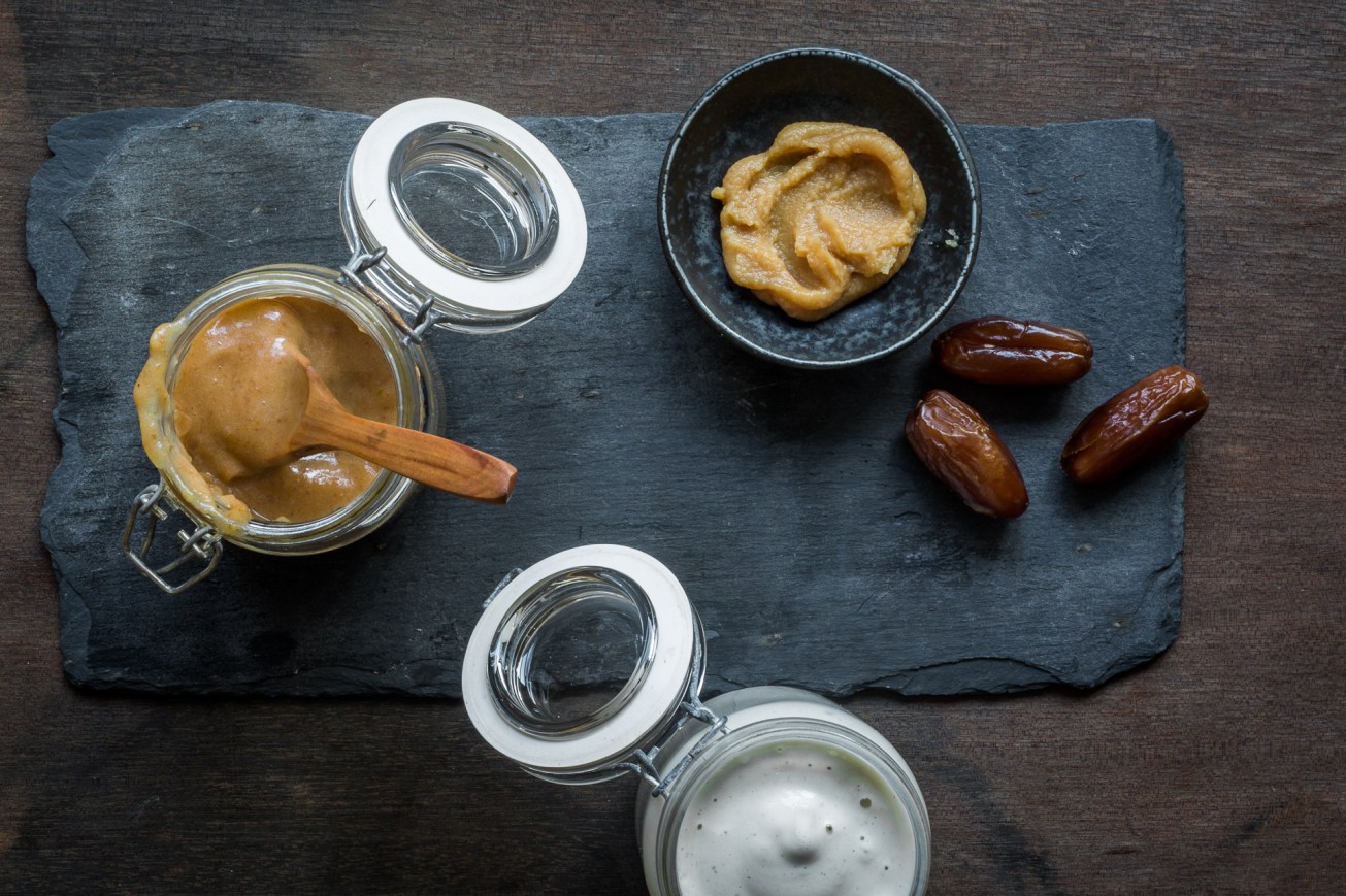 Nicht nur, weil wir bekennende Süßzähne sind, sondern auch, weil besonders ich die Kombination von Süßem und Salzigem sehr schätze. Karamell mit Miso: Daran führte daher kein Weg vorbei. Karamell bereite ich seit einiger Zeit ohne Zucker zu, den wir selten im Haus haben, und zwar auf einer Basis von Datteln, Ahornsirup und Nuss- oder Mandelsahne. Ich habe hier Claudias Rezept also etwas verändert, aber wir waren gleichermaßen von der Zugabe von Shiro Miso begeistert.