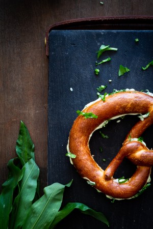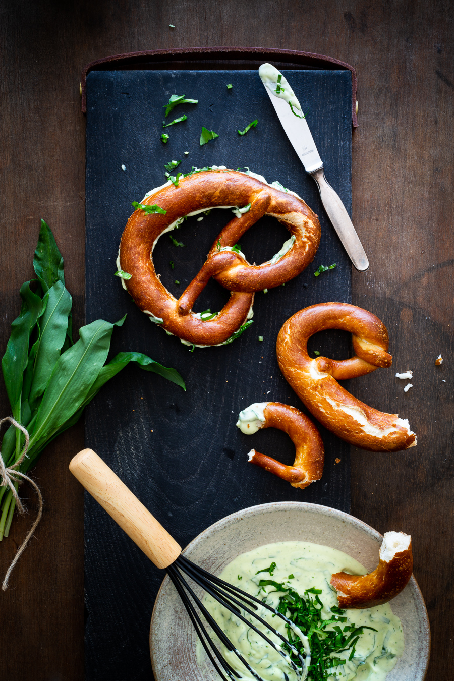 Den restlichen Bärlauch in feine Streifen schneiden und unter die fertige Mayonnaise heben. Mit der angegeben Menge wird das Aroma kräftig, wenn ihr eine dezente Note vorzieht, schneidet am besten nur 2-3 Blätter klein. Et voilà! Die Brezeln damit bestreichen oder aber das Gebäck brechen und die Mayo zum Dippen dazu reichen. Und nun: Genießt den Frühling bei bestem Appetit!
