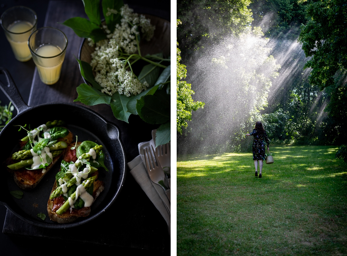 Whenever elder blossom harvest is due, we do a little photo shoot since the white panicles are simply beautiful. That is, there are plenty of foraging pictures in our archive ;-). And a few more should be added the other day. But this time something was different than usual: on our way back through the park, suddenly all water sprinklers seemded to give it a go at the same time and gave the magnificent and huge old trees gentle showers. The bright morning light was shining through the fine water cascades, and the whole scenery glistened. True magic, and one of those moments that Arne as a landscape photographer is always waiting for, an unexpected scene, a special light, a peculiar mood …
