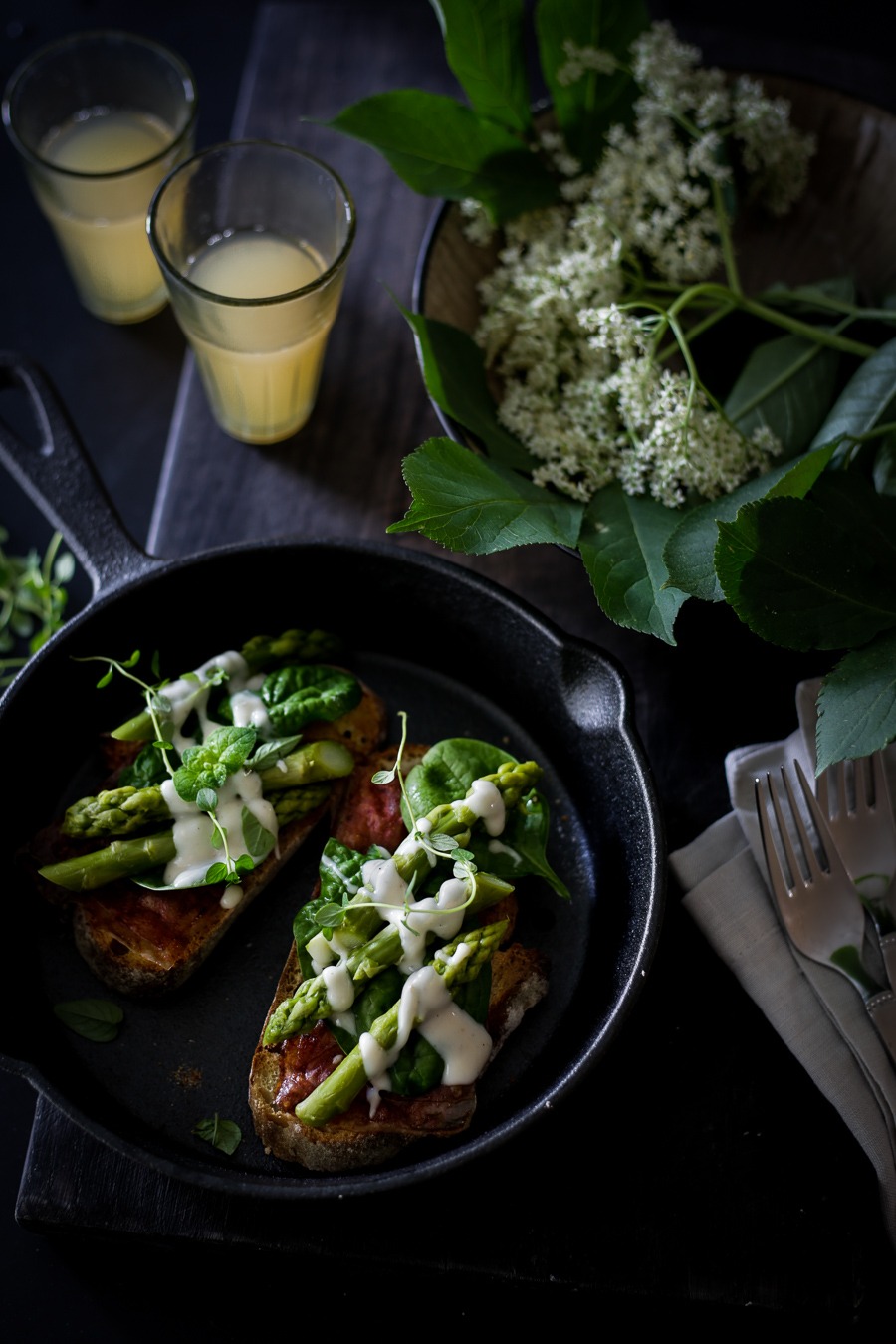How beautiful is asparagus season, and likewise lovely is the that time of the year when elder bushes are in high bloom! Every year, we look forward to the cute blossom’s foraging, and most of the treasure turns into elder blossom vinegar later on which is a staple in our stocks (find the recipe from our book in this blog post). With its fine acidity and gentle floral flavor it graces not only salads of all kinds, but is also great for sauces and even for sweet treats – just have a try if you like. Meanwhile, the new provisions are in the making, and the very last remains of last year’s vintage has now infused a delicious sauce Hollandaise based on silken tofu. Of course we had it with asparagus – nature had something delicious in mind to let the two of them ripen at the same time…
