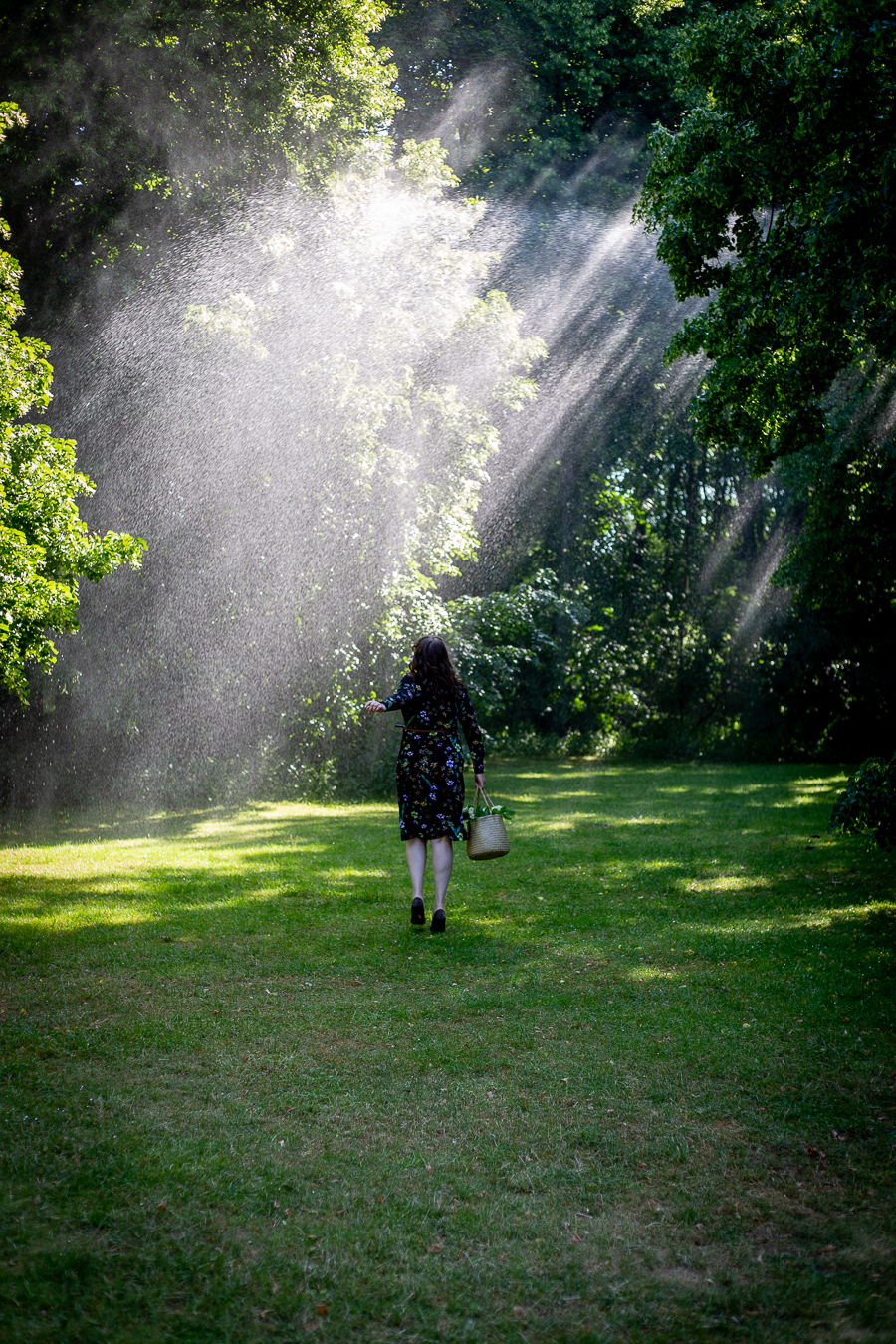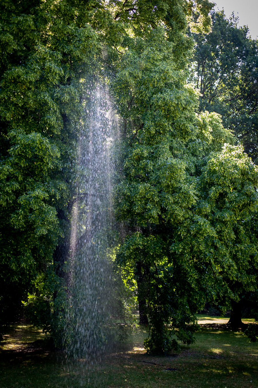 Immer wenn die Holunderblüten-Ernte ansteht, machen wir natürlich auch ein kleines Foto-Shooting, weil die weißen Schirmrispen einfach wunderschön sind. Das heißt, in unserem Archiv schlummern Mengen an entsprechenden Bildern vom Pflücken und Schnuppern, und neulich sollten also ein paar weitere hinzukommen. Aber diesmal war etwas anders als sonst: Auf unserem Rückweg durch den Park gngen plötzlich gefühlt alle Wassersprinkler gleichzeitig an und tauchten die herrlichen alten riesigen Bäume in feine Wasserkaskaden, durch die das gleißende Morgenlicht fiel. Ein magischer Anblick, und einer jener Momente, auf die Arne als Natur-Fotograf eigentlich immerzu wartet, eine unerwartete Szene, ein besonderes Licht, eine eigentümliche Stimmung…