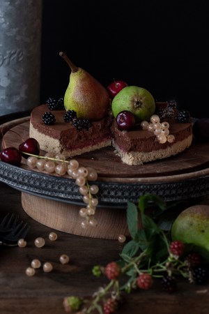 Für die Fruchtschicht das Obst waschen, Birne und Zwetschgem entkernen und grob hacken. Mit den Brombeeren in einen hohen Mixbecher geben und pürieren. In einem sehr kleinen Topf das Agar-Agar in 50 ml kaltes Wasser einrühren, aufkochen und eine Minute köcheln lassen. In eine Schüssel füllen und ganz leicht abkühlen lassen, dann nach und nach das Obstpüree unterrühren. Das Fruchpüree auf den abgekühlten Keksboden gießen und gleichmäßig verstreichen, dabei bis zum hochgezogenen Rand des Keksbodens auffüllen. Nochmals abgedeckt eine halbe Stunde kühl stellen.