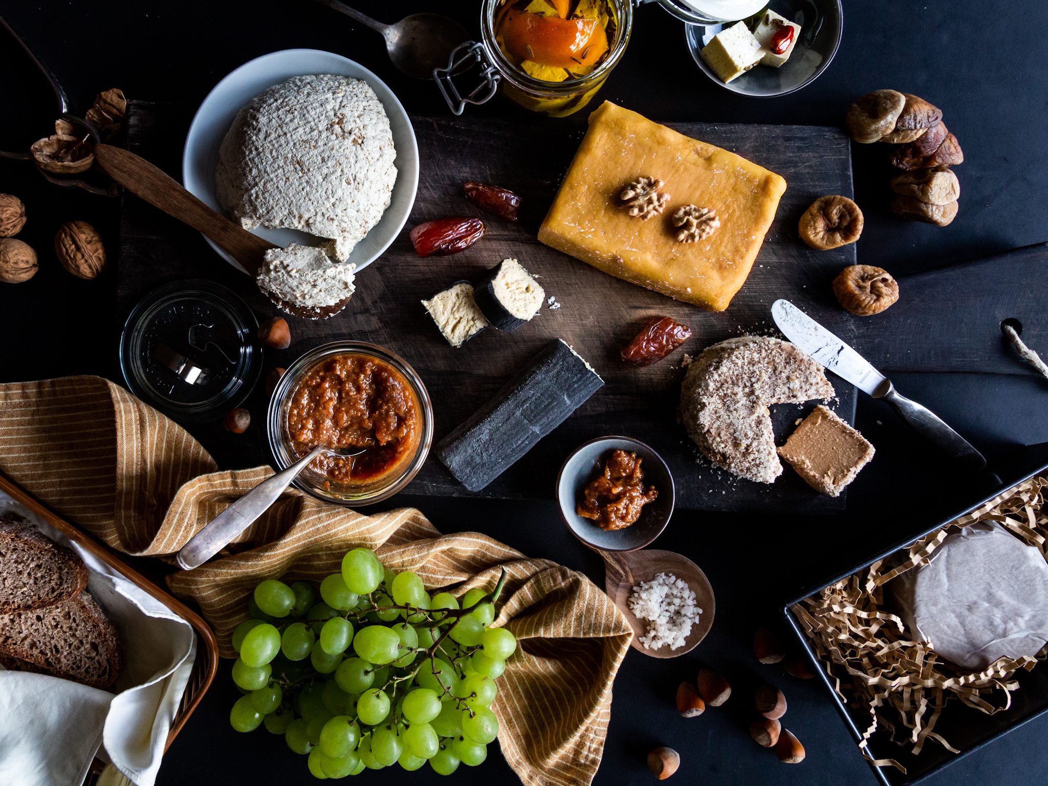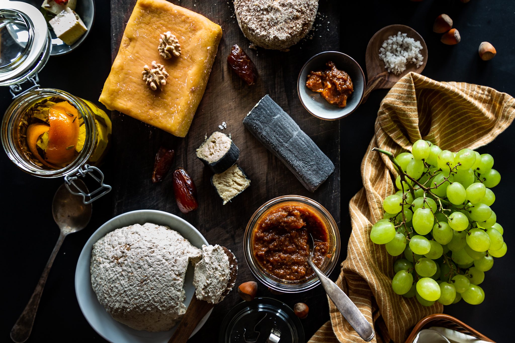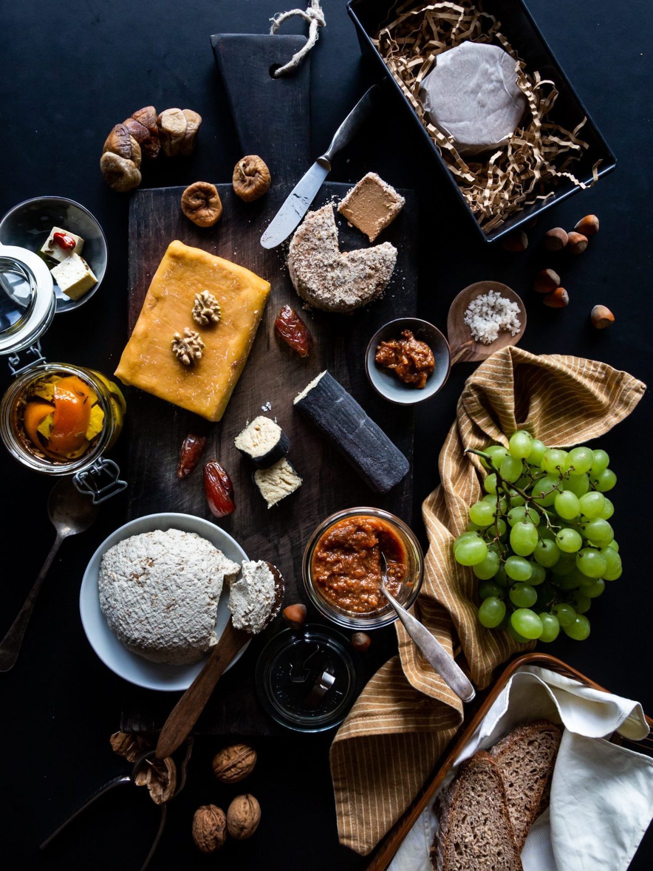 Does a modern vegan cuisine need to „copy“ dairy (or meat) substitutes? It can be a yes or a know, depending on the way you look at it. What we do know is that it is delicious and playful, just as any new culinary experience, and that new found land meets well beknown (and beloved) terrains: Vegan cheese is different in flavor, yet similar in (umami) taste and mouthfeel. It is new when it comes to ingredients, yet familiar regarding the situation and combination when having cheese – pieces of seducing treats all on a plate, shared with friends or family over a glass of wine, good bread, maybe a fruit mustard or whatever you prefer along with your selection of cheese. And on top – just to mention, because New Year’s Day is a lot about making resolutions 😉 – it is environmental-friendly to also make vegan choices.