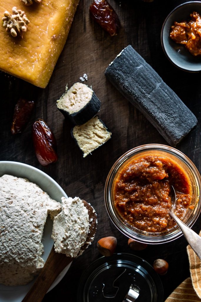 This year, we decided for a true feast with a whole cheese plate, all varieties vegan and home-made, inspired by Sebastien Kardinal‘s book “Ma petite crėmerie vegane”. It had been among the Christmas presents, and it is a wonderful source of inspiration for vegan cheese-making. I chose five recipes which I adopted to our personal taste and favorite flavors, and ended up with a variety of cheeses that you won’t find in your organic store around the corner (however, nothing said against vegan cheese alternatives in stores, we adore Cashew Camembert for example).