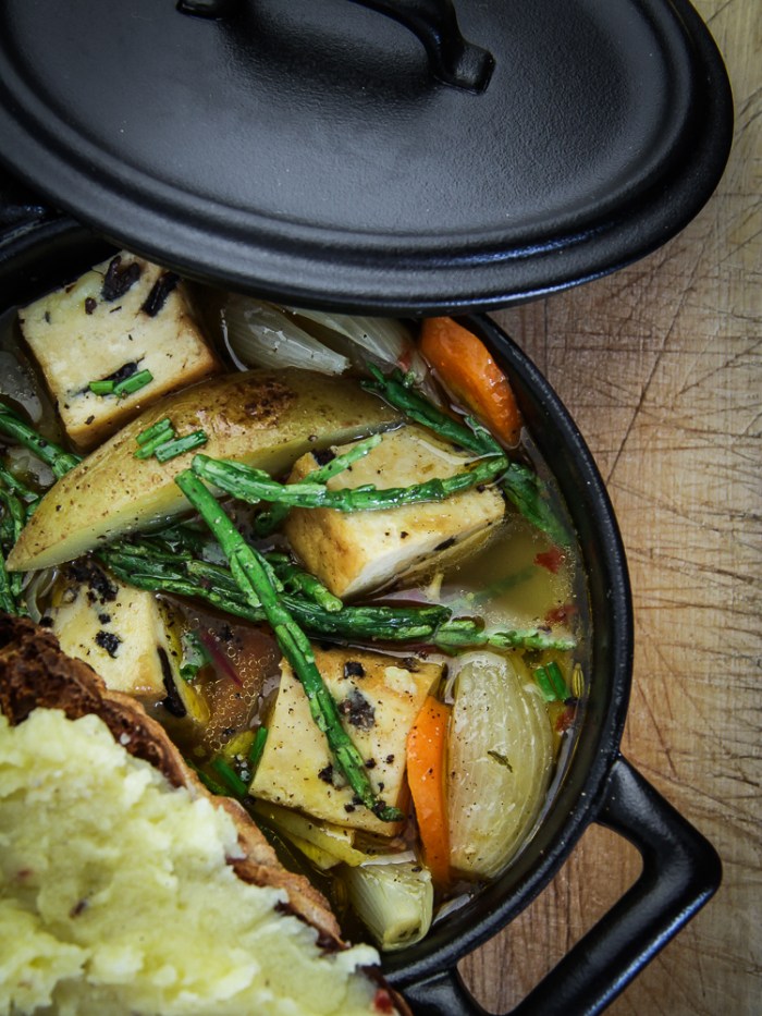 Oven-Baked Vegetarian Bouillabaisse with Salicornia, Arame Tofu and Rouille