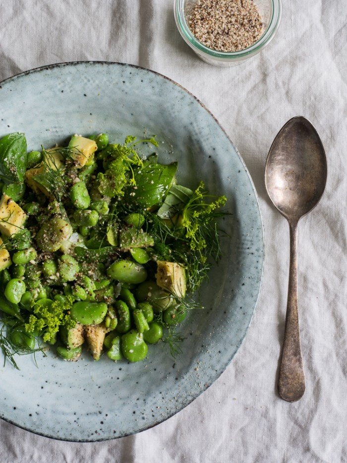 Fava Beans with Avocado, Dill Blossoms and Dukkah