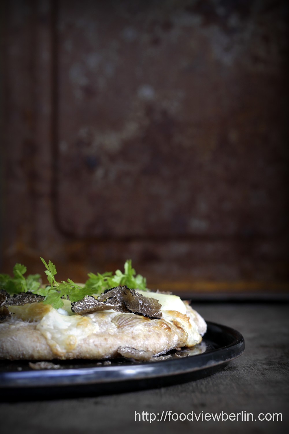 Pizza bianca with white asparagus and fresh summer truffles